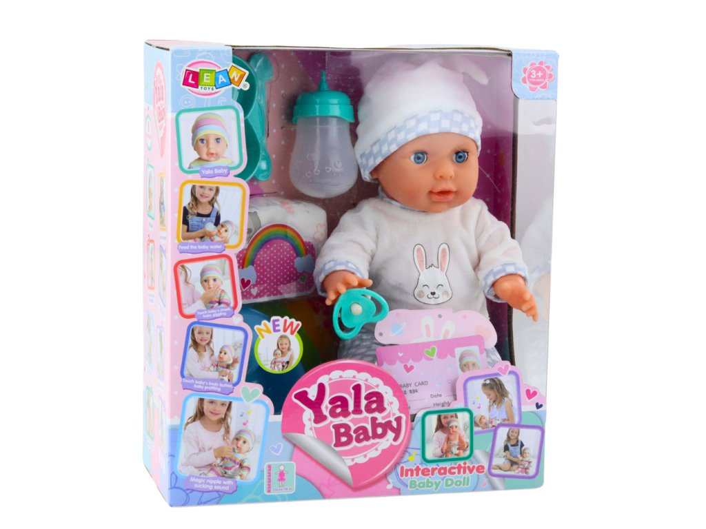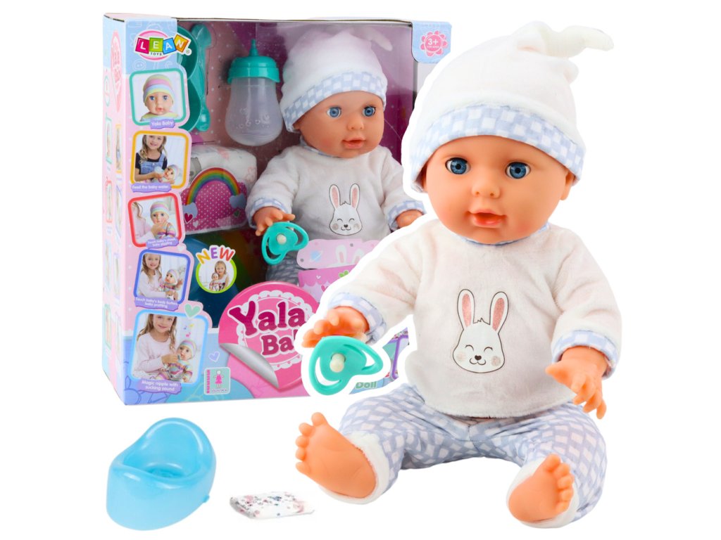 Panenka je oblečená v barevné halence se zajíčkem, pohodlnými kalhotami a roztomilým kloboučkem. V ruce drží dudlík a sada obsahuje potřebné doplňky pro krmení a péči - včetně lahvičky, nočníku a plenky.