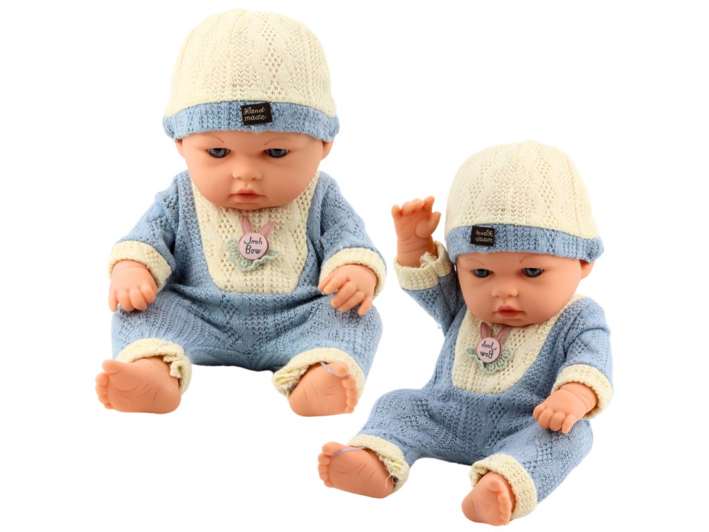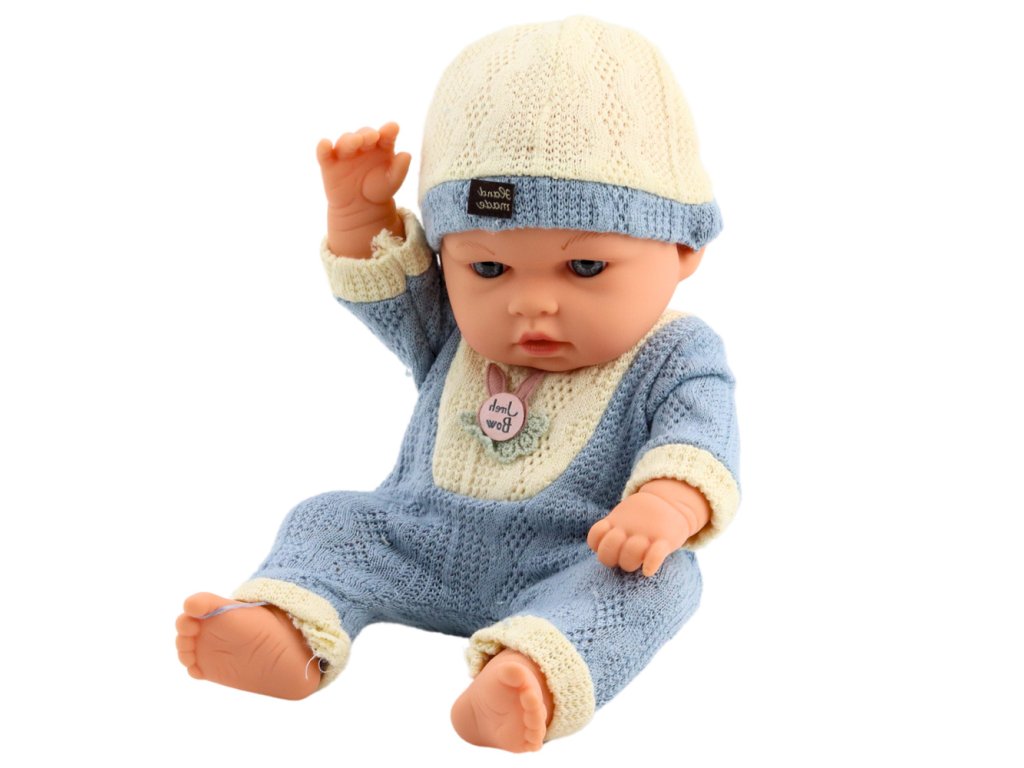 Panenka miminko v modrém pleteném oblečku s čepičkou