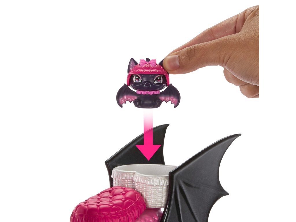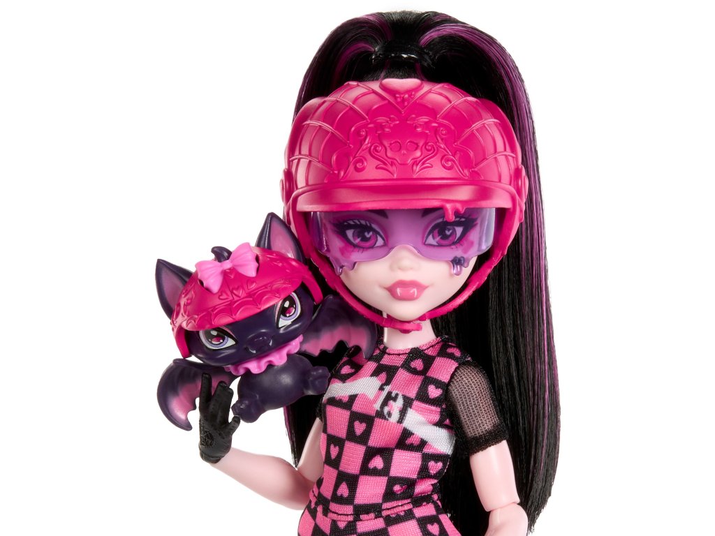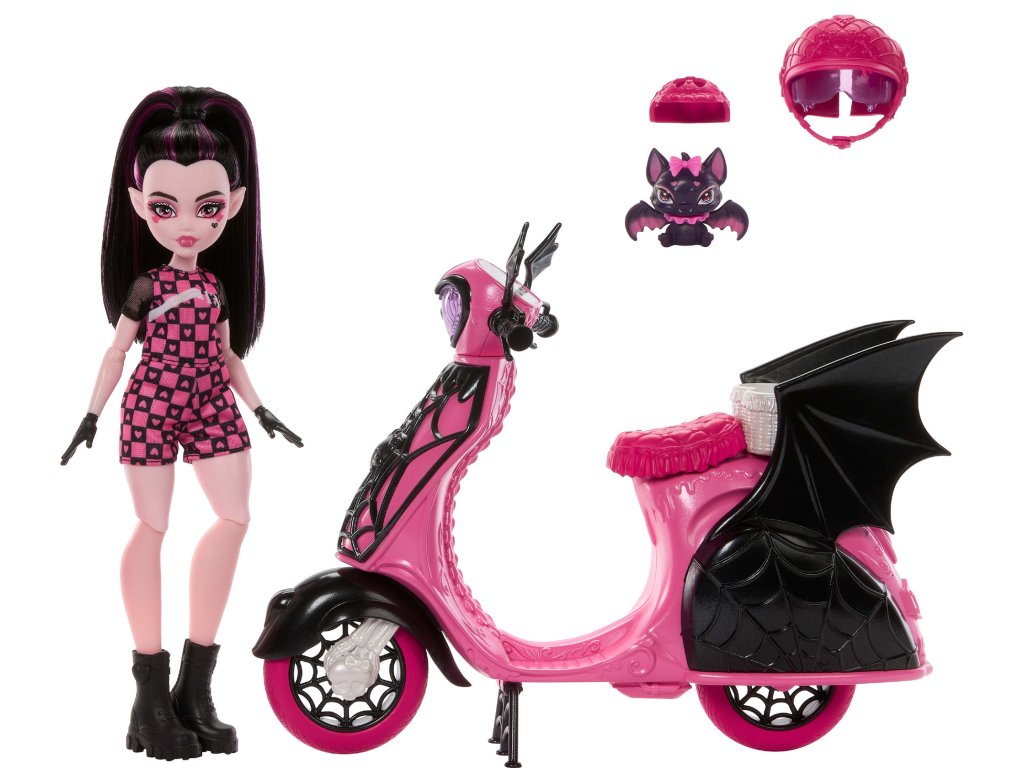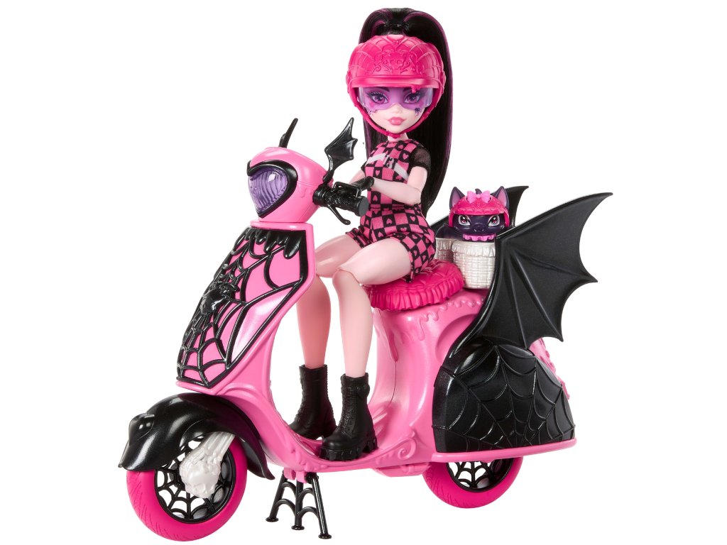 Panenka Draculaura je připravena na parádní jízdu na svém růžovém a černém skútru a její věrný netopýří společník Count Fabulous s ní cestuje ve speciálním košíku. Sada potěší detaily – otočná kola, stojánek a kouzelně navržené sedadlo pro domácího mazlíčka, díky čemuž bude jízda vypadat jako skutečné dobrodružství na motorce.