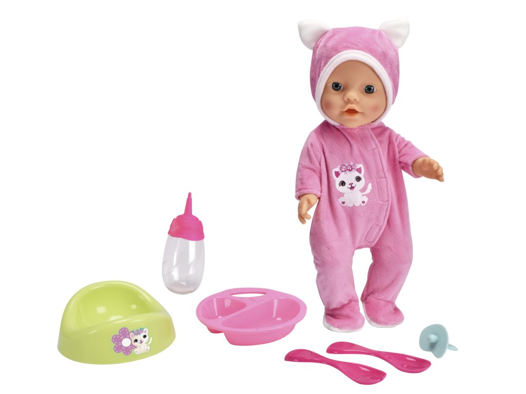Tato sada se skládá z panenky a doplňků. Panenka je vyrobena celá z gumy. Je oblečená v krásném růžovém pyžamu s potiskem koťátka a roztomilé čepici s ušima. Sada obsahuje dudlík, lahvičku, talíř a příbory a také nočník zdobený samolepkou s růžovou květinou.