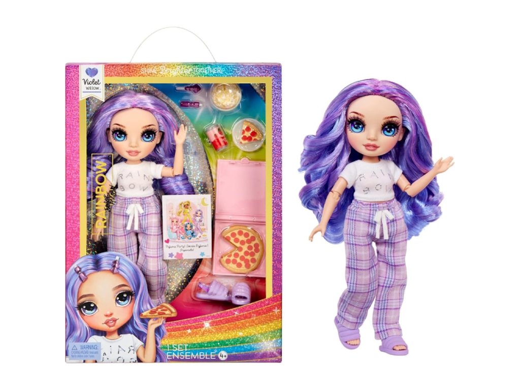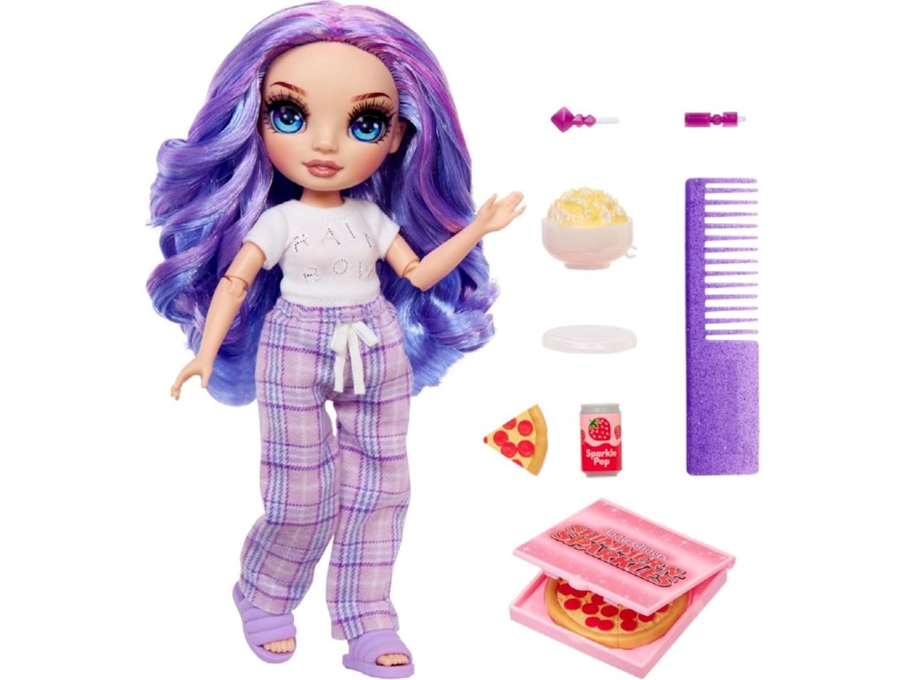 Panenka Violet Willow z Rainbow High Junior 503705 na pyžamovou pártyStudentky Rainbow High a Shadow High jsou módní a pohodové. Kamarádky Ruby, Poppy, Sunny, Skyler a Violet navštěvují tu nejneobyčejnější uměleckou školu na světě a vytvářejí stylové oblečení a úžasné doplňky. Tyto módní panenky mají dlouhé vlasy, které se perfektně hodí k úpravě účesu, a mají klouby pro různé pózy. Violet je oblečená v rozkošných fialových kostkovaných kalhotách a měkkém tričku s odpovídajícími fialovými pantoflemi. Má okouzlující, mladistvý obličej, krásné dlouhé fialové vlasy s kudrnatými vlasy, dlouhé řasy a skelné oči. Speciální vlastnosti: Violet měří 22 cm a je plně kloubová a polohovatelná. Můžete si zahrát scénky jako mladší verze Violet nebo si s ní a její 28cm verzí hrát jako s její starší sestrou. Panenka je plně kloubová a polohovatelná. Její hlava, paže, ruce a nohy se ohýbají a vytvářejí tak mnoho zábavných póz. Každá kamarádka si na pyžamovou párty přinese své oblíbené doplňky. Violet přináší lahodné jídlo a mezi jejími doplňky najdete pizzu v krabici, popcorn, talíř a limonádu. Po vyjmutí panenky z krabice jí umyjte vlasy, abyste odstranili stylingový gel, a nechte je zcela uschnout; pak jsou vlasy připraveny k česání. Sada obsahuje: • panenku Violet Willow, • pantofle, • pizzu v krabici, • popcorn, • talíř, • limonádu, • 2 sponky do vlasů, • hřeben. Věk: • 4+.