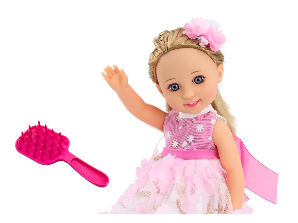 Panenka má dlouhé blond vlasy, které lze různě upravovat, a součástí sady je kartáč na česání a úpravu vlasů. Vlasy navíc zdobí půvabná sponka, která dodává panence jedinečný šarm. Panenka má na sobě krásné růžovo-bílé šaty zdobené růžovými květy a zlatými doplňky. Šaty jsou elegantní a stylové, ideální pro každou příležitost. Panenka má na sobě růžové boty, které se k jejím šatům dokonale hodí. Má jemný make-up, který podtrhuje její elegantní vzhled, a pečlivě namalované oči a rty, což jejímu vzhledu dodává výraznost a šarm.