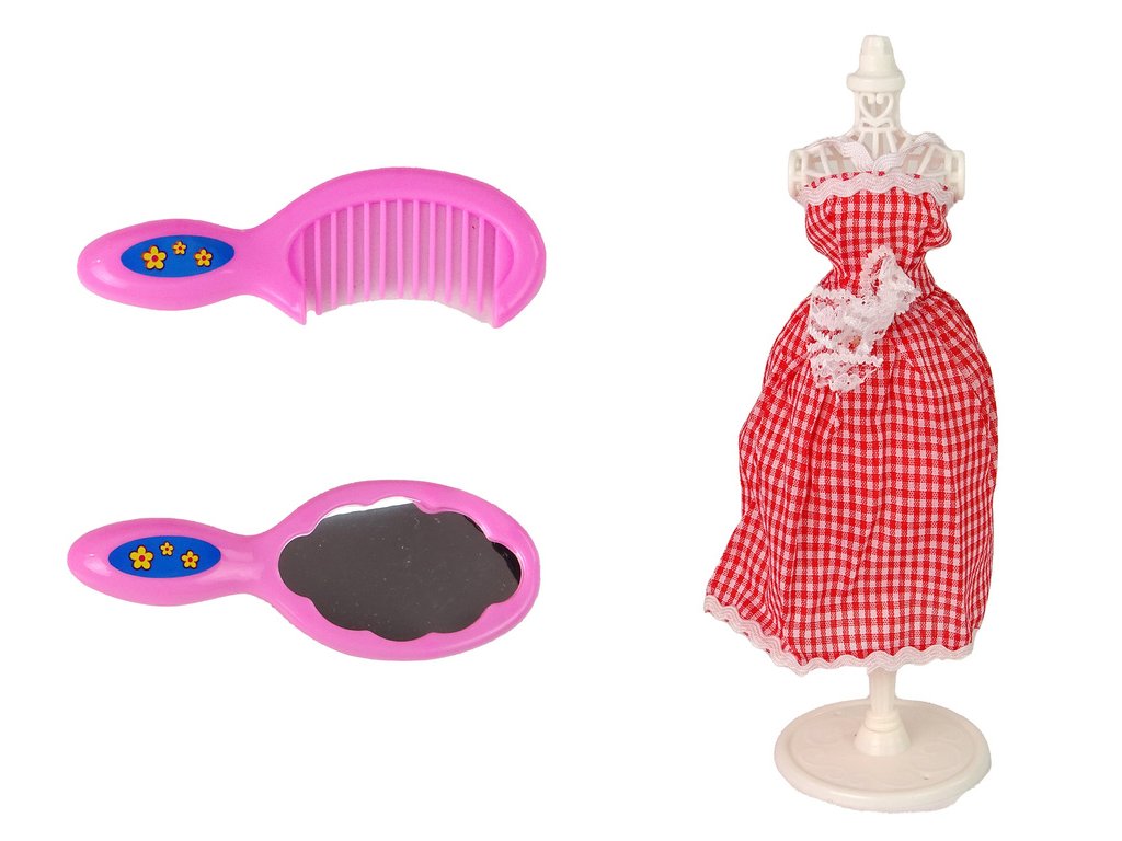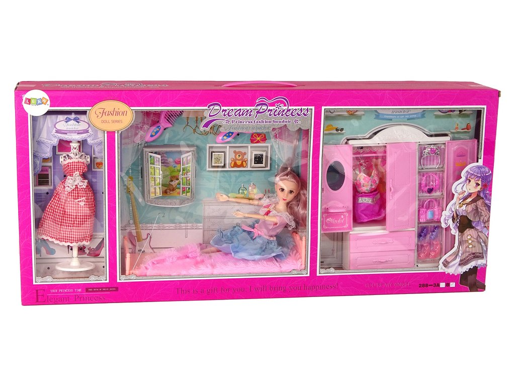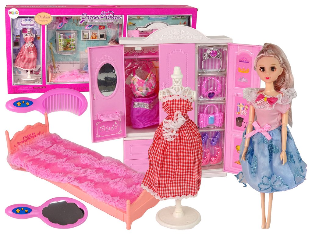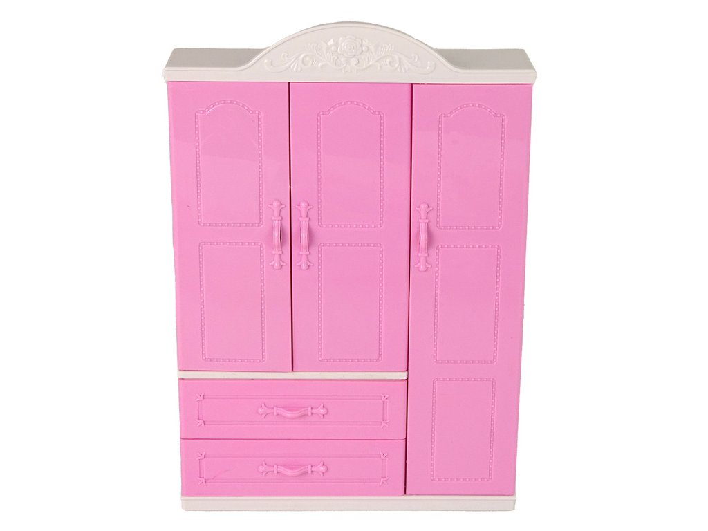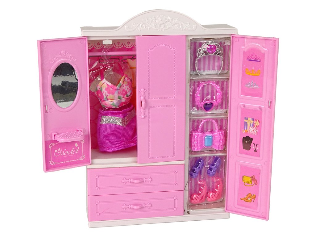 Šatní skříň s oblečením je skvělou volbou pro dívky, které si rády hrají s panenkami, oblékají je a upravují. S příslušenstvím obsaženým v sadách bude zábava skvělá. Je navržena ve světle růžové barvě spolu s toaletním stolkem na vnitřních dveřích. Uvnitř najdete šaty a doplňky - kabelku, boty na podpatku, náhrdelník nebo korunku.