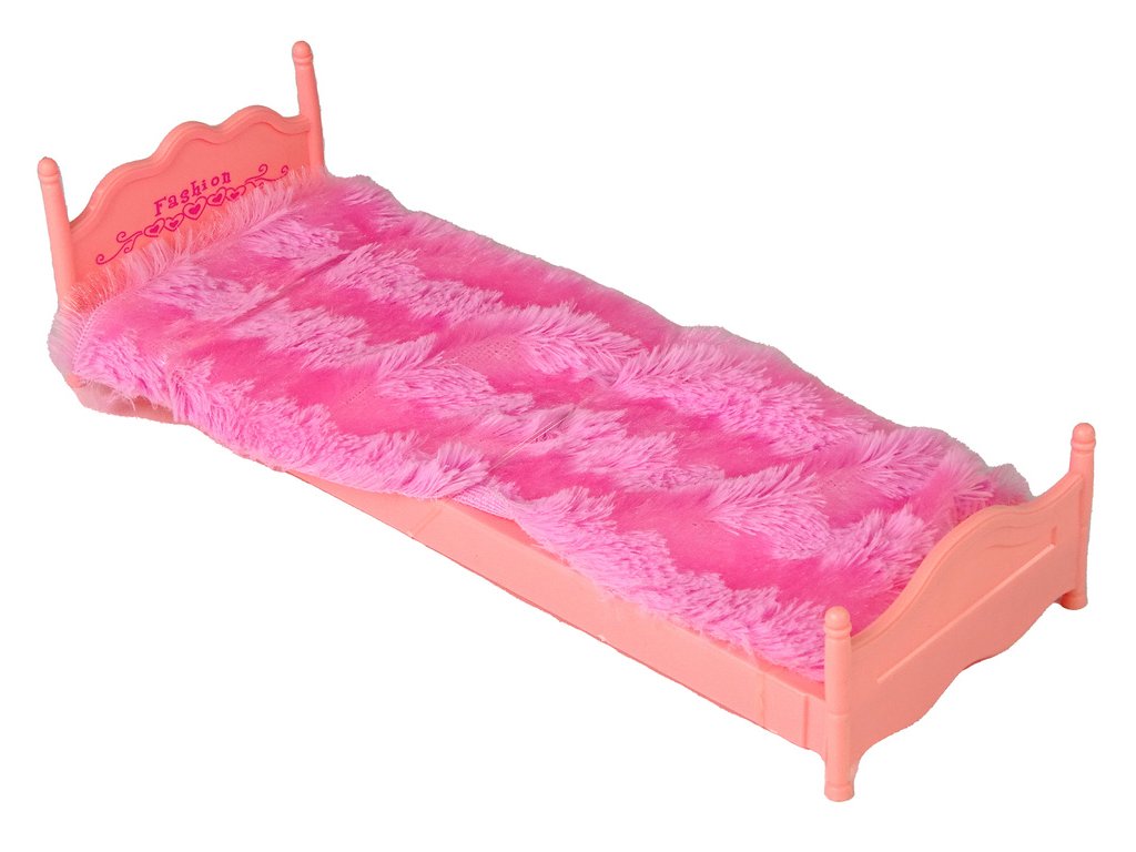 Kromě toho zde najdete i profesionální stojan na šaty, který může doplnit dekor nebo mít praktické využití - k zavěšení šatů. Postýlka s růžovým chlupatým přehozem doplní zařízení pokojíčku v domečku pro panenky.