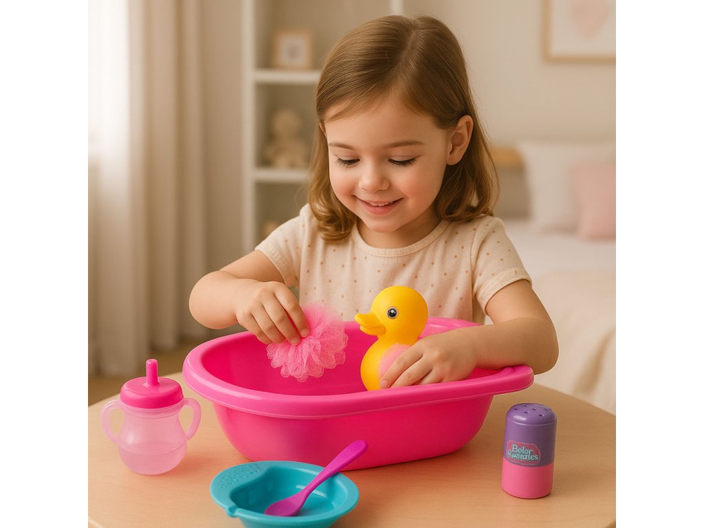 Tato sada do koupelny pro panenky s vaničkou je komplexní, tematickou hračkou, která dětem umožňuje hrát si na každodenní činnosti spojené s péčí o panenky. Koupání rozvíjí fantazii, učí péči, zodpovědnosti a empatii a pomáhá dětem napodobovat známé každodenní situace. Sada umožňuje vytvořit domácí koupelnu pro panenky a podporuje kreativní hru jak individuálně, tak s vrstevníky.