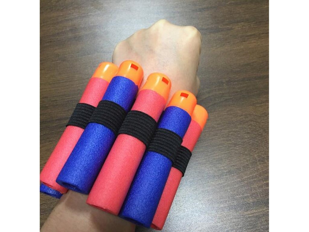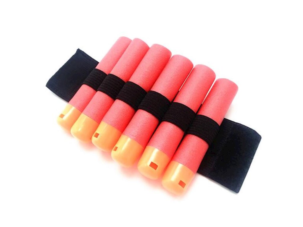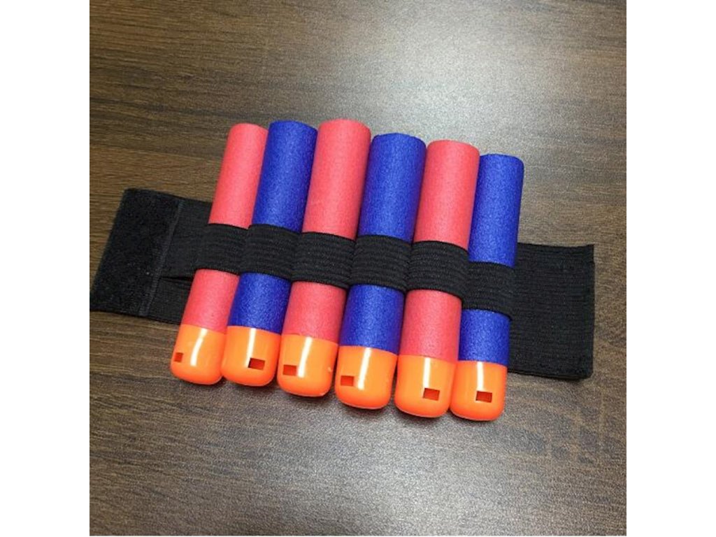 Díky náramku budete mít zásobu šípů vždy u sebe. Vždyť co je to za zábavu, když vám během důležitého střetu dojdou šípy? Náramek je vyroben z černé látky s přídavkem gumy, takže se natáhne a padne na každou ruku. Zapíná se na suchý zip. Páska má prostor pro 6 šípů.Obsah sady:
