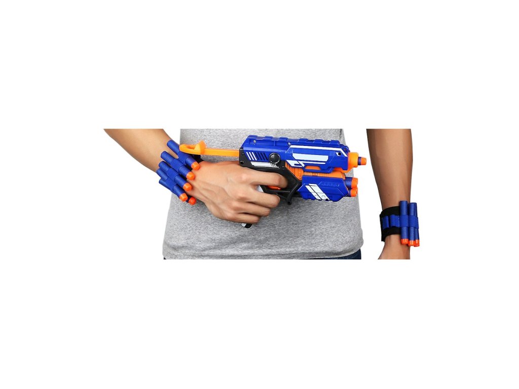 Díky náramku budete mít zásobu šípů vždy u sebe. Vždyť co je to za zábavu, když vám během důležitého střetu dojdou šípy? Náramek je vyroben z černé látky s modrou gumou, takže se roztáhne a padne na každou ruku. Zapíná se na suchý zip. Na pažbě je místo na 8 šípů.Obsah sady: