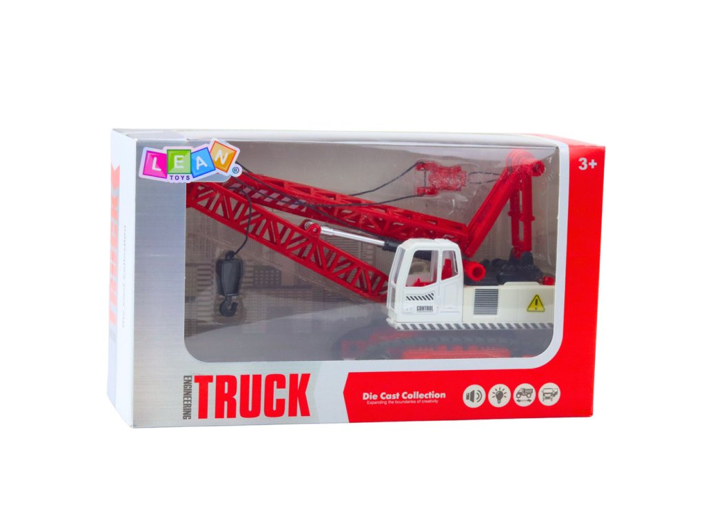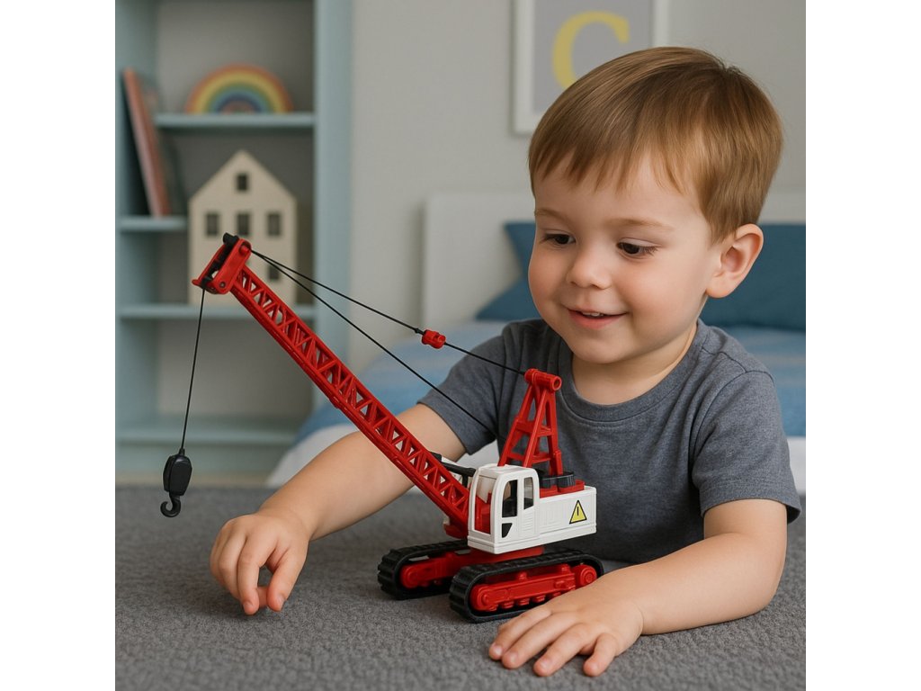 Jeřáb je vybaven knoflíkem nastavitelným výložníkem s hákem, který umožňuje zvedání a spouštění součástí během hry. Kabina se otáčí kolem vlastní osy, což umožňuje plnou rotaci a ještě realističtější hru. Model navíc disponuje světelnými a zvukovými efekty, které se aktivují, když je vozidlo v provozu, čímž děti seznámí se světem stavebních strojů a umocní zábavu. Hračka se pohybuje po housenkách, což jí dává pocit skutečného terénního vozidla. To je skvělý nápad na dárek, který potěší každého malého nadšence do stavební techniky.
