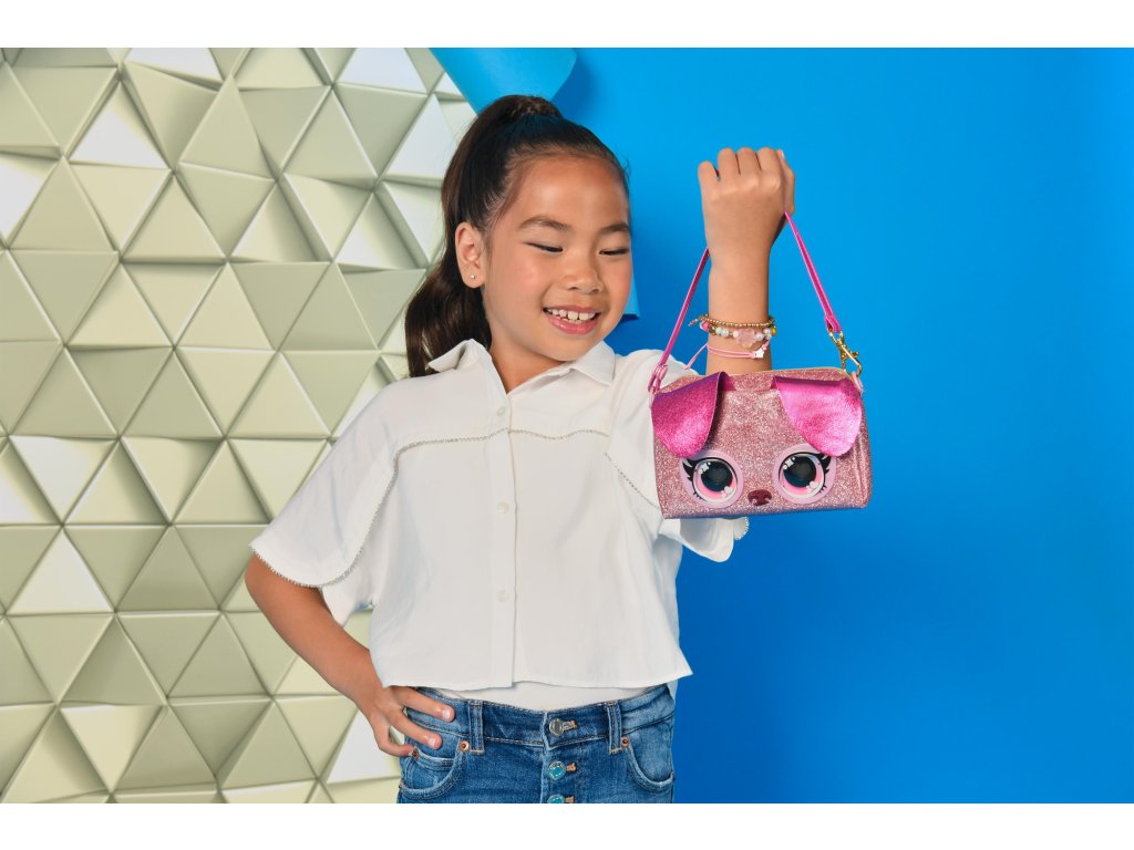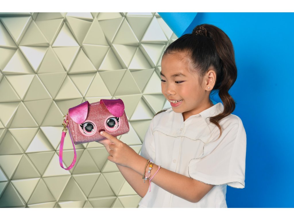 Tato roztomilá kabelka je v růžové barvě . Má to pár velkých očí, které se po stisknutí na nos rozsvítí různými barvami.