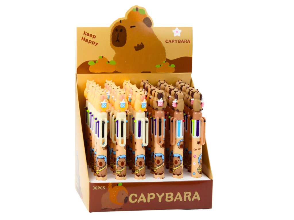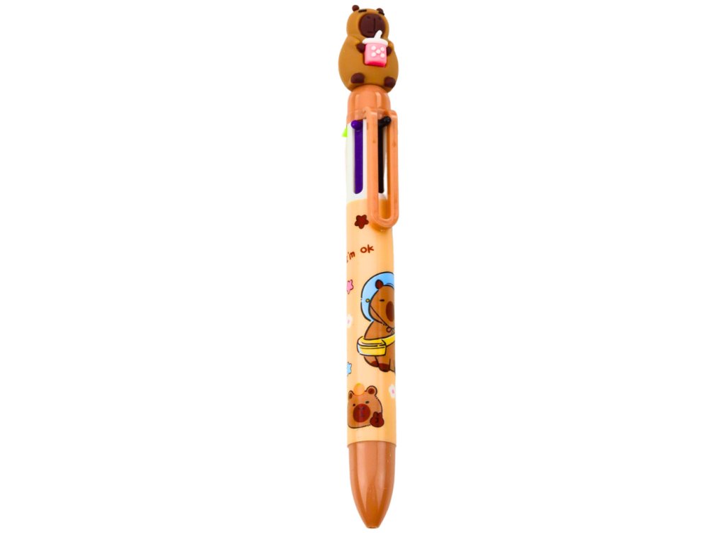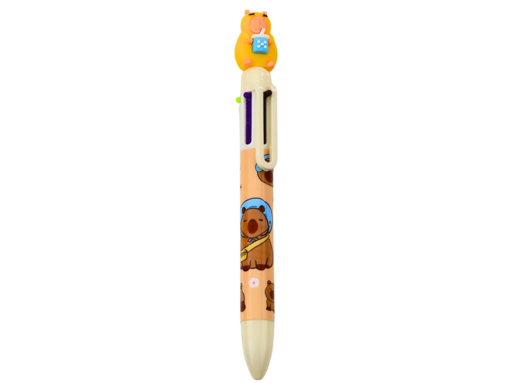 Barevné pero s motivem kapybary je nejen funkční psací nástroj, ale také zábavná vychytávka, která zpestří školní i domácí zápisky. Pero obsahuje až 6 barev inkoustu v jednom pouzdře, což umožňuje pohodlné přepínání mezi barvami pomocí výsuvných tlačítek. V horní části každé ohrádky je půvabná figurka kapybary s kalíškem, což z ní dělá atraktivní doplněk pro děti a fanoušky půvabných motivů.