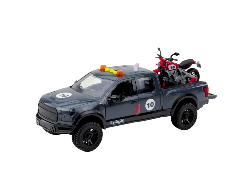 Celé je vyrobeno z kvalitních, odolných a bezpečných materiálů, které splňují normy bezpečnosti hraček. Pevná konstrukce a pečlivá povrchová úprava činí hračku odolnou vůči intenzivnímu používání. Realistický vzhled vozidla a motocyklu vybízí ke hře a podporuje rozvoj kreativity a manuálních dovedností dítěte. Toto je ideální tip na dárek pro každého malého fanouška motorových vozidel a terénních akcí.