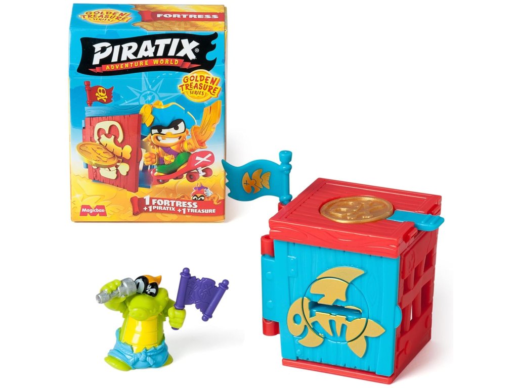 Vstupte do světa dobrodružství s Piratix Adventure World - Zlatý poklad ! Tato vzrušující sada přenese děti přímo na Žraločí ostrov , kde na ně čekají tajemství, poklady a akční pirátské bitvy. Každá pevnost Piratix je jedinečný úkryt s tajemstvím, které je třeba odhalit - je k dispozici 6 různých pevností, které lze sesbírat , každá s jinou barvou a jedinečným stylem.