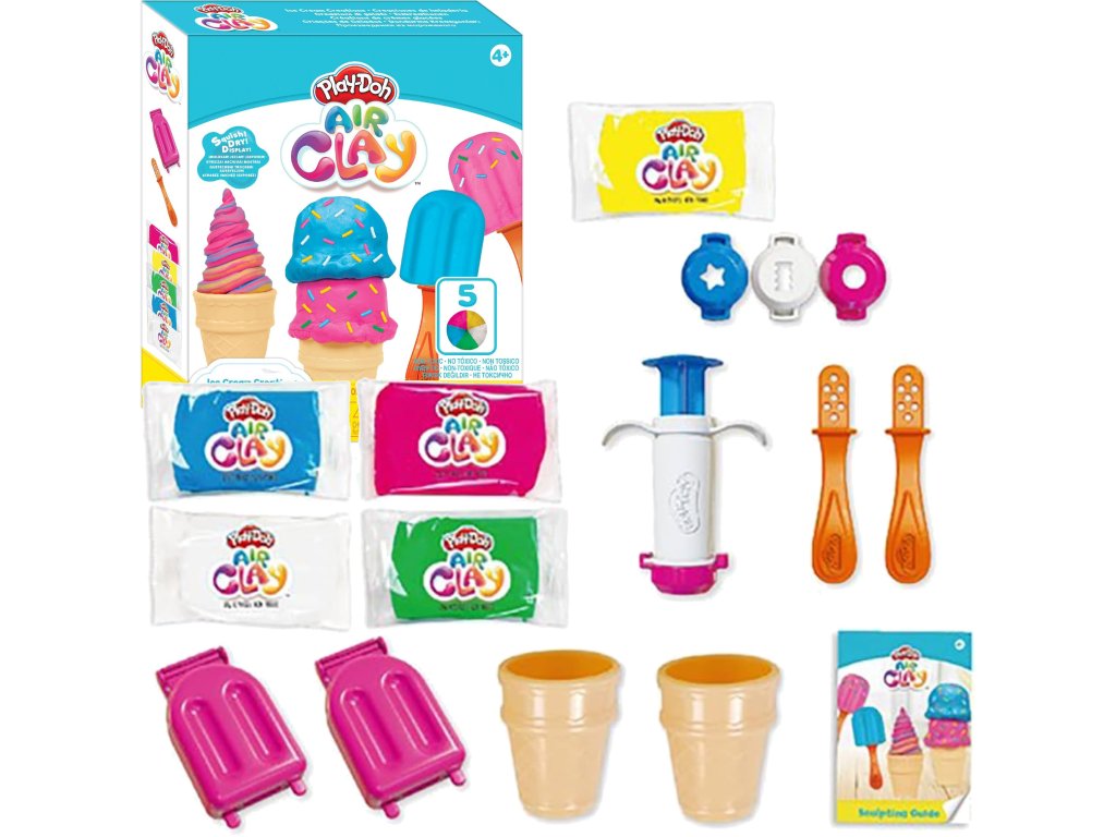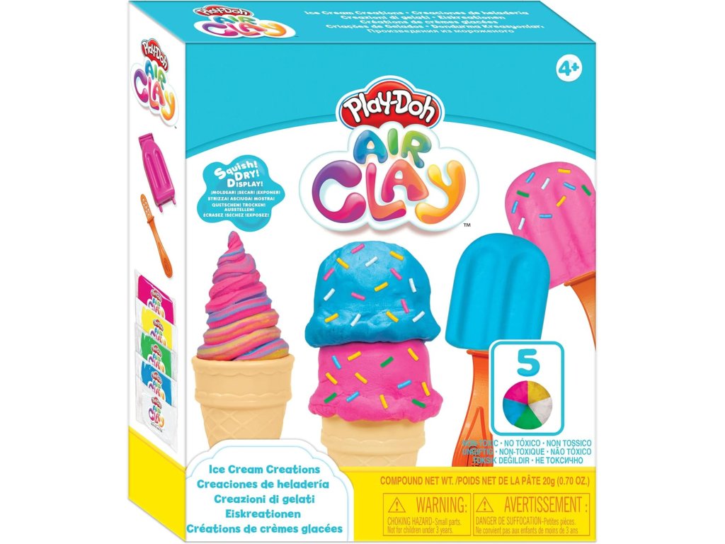 Play‑Doh Air Clay Ice Cream Creationsje kreativní hračka, která umožňuje dětem od 4 letmodelovat si vlastní zmrzlinuz netvrdnoucí, lehkéhlíny. Díky živým barvám a jednoduchým tvarům mohou malí tvůrci vyrobit kornouty i zmrzlinu na špejli a efekty – po zaschnutí – jsou perfektní provýzdobu pokojíčku nebo další zábavu.