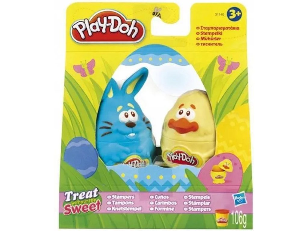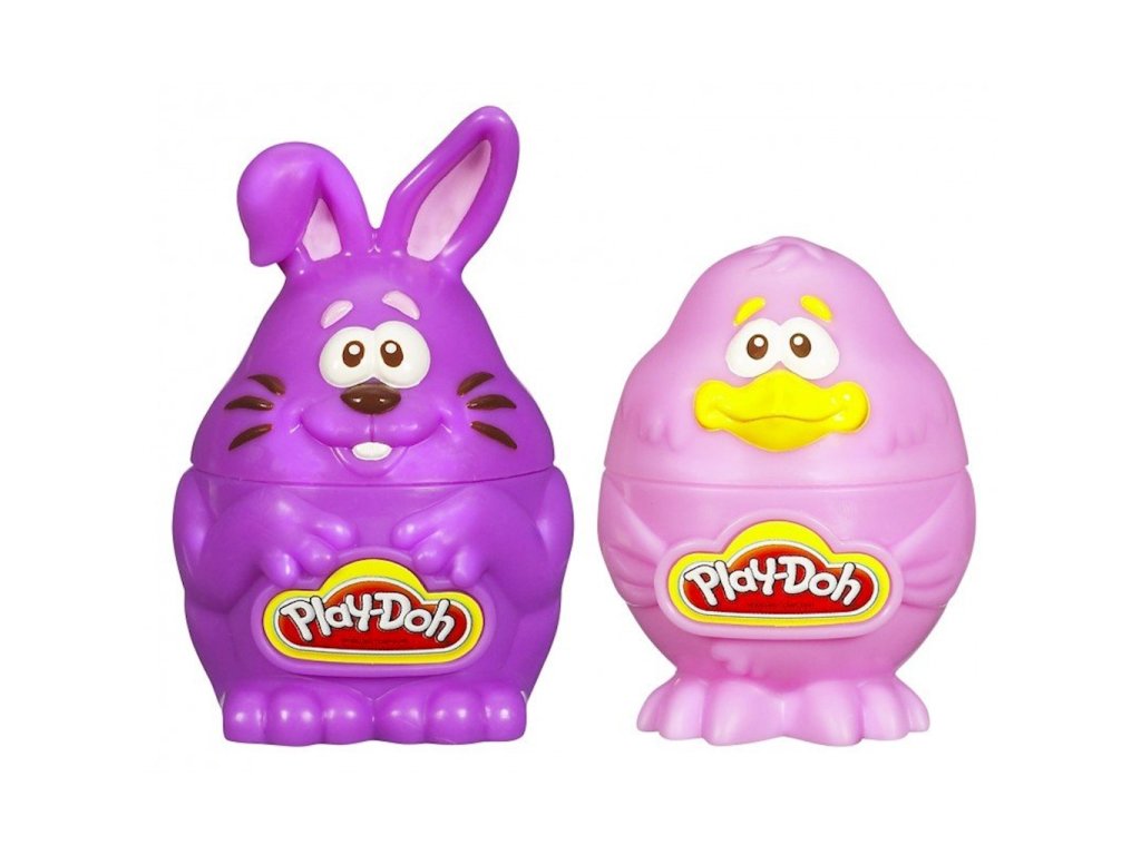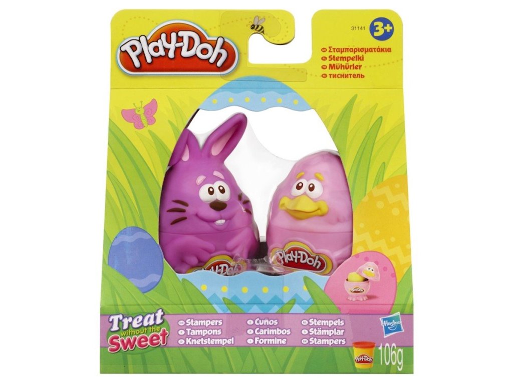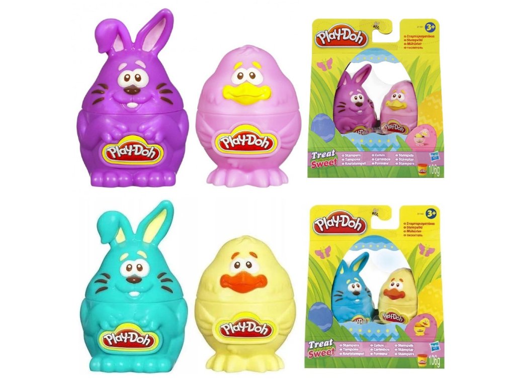 Play-Doh Play-Doh Set velikonočních razítek růžová a fialová + modrá a žlutáPlay-Doh je měkká plastická hmota, díky které mohou všechny děti vytvořit, o čem sní. Sada může být skvělým nápadem na dárek pro velikonočního zajíčka! Vynikající barvy vám umožní vytvářet barevné a vzorované tvary z hracího těsta velikonoční vajíčka. Pod nohama zvířátek jsou razítka, která umožňují otisknout vzor mrkve a kuřátka na hrací těsto. Samotné formy na zajíčka a kuřátka vám umožní uložit plastovou hmotu a zároveň ozdobit váš pracovní stůl nebo skříň.