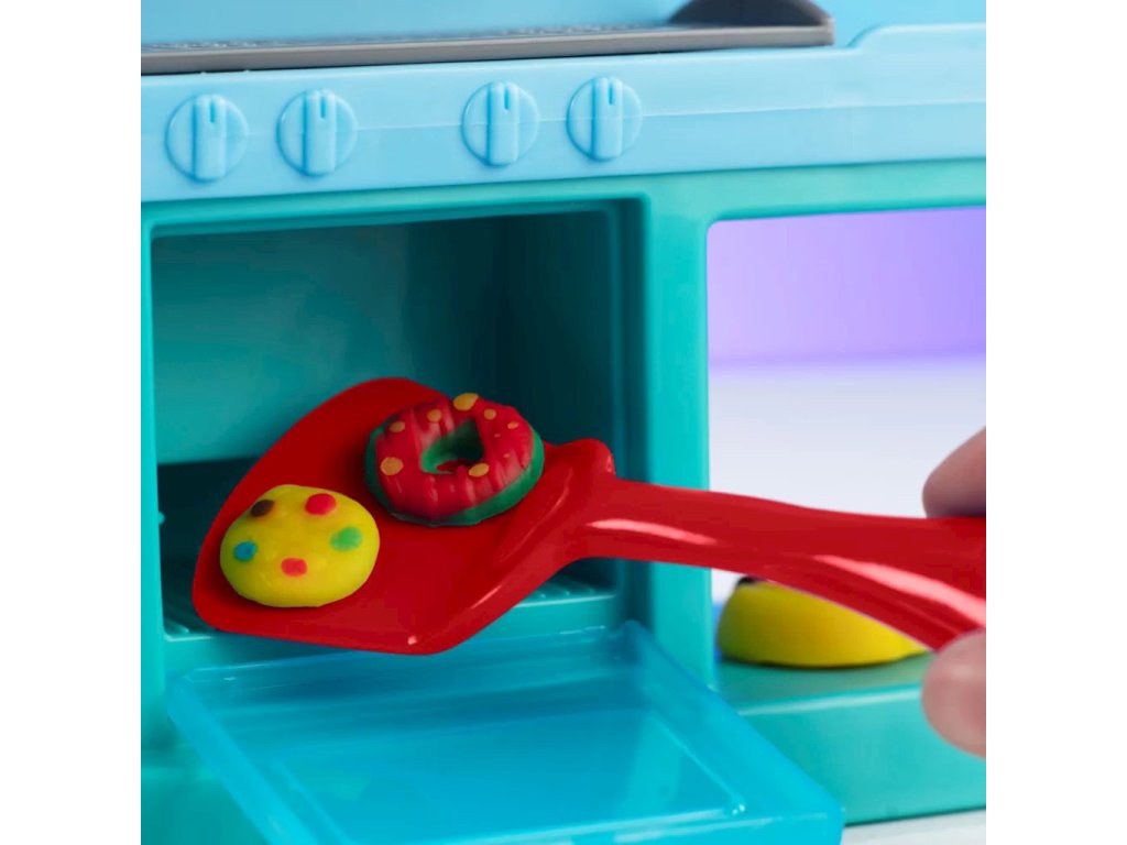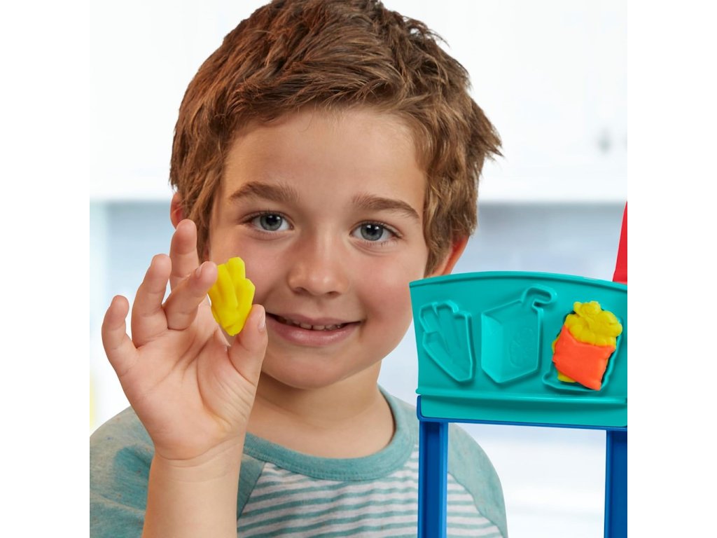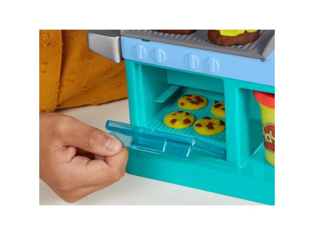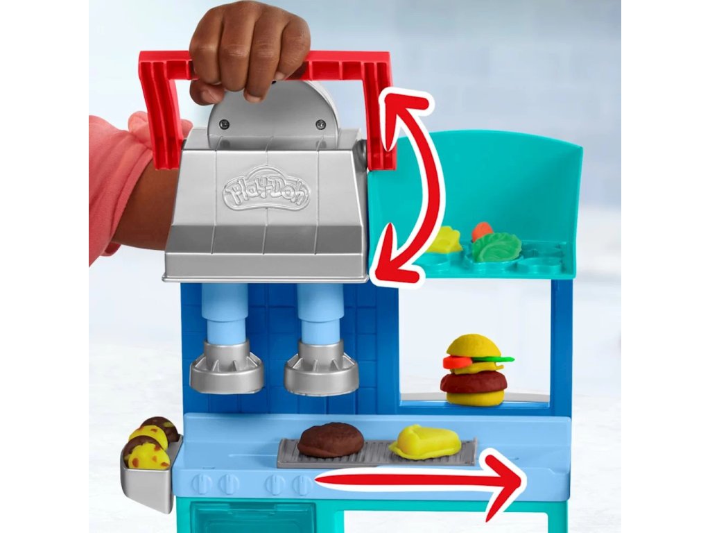 S touto dětskou kuchyňskou sadou si mohou malí kuchaři připadat, jako by vedli vlastní restauraci! Vytvářejte, přizpůsobujte a sdílejte úžasné pokrmy vytvořené pomocí cukrářského krému Play-Doh. 4 razítka - stačí stisknout páčku, aby se na těstolinu odrazily dva tvary najednou! Po uvolnění páčky se rošt přesune na vedlejší stanici - je čas na dokončovací práce. Malí kuchaři mohou připravit polevy, aby jejich pokrmy vypadaly jako opravdové. Posledním krokem je servírování - děti mohou své výtvory z těsta položit na talíř a předat je okénkem čekajícímu zákazníkovi!Jedinečné vlastnosti sady: