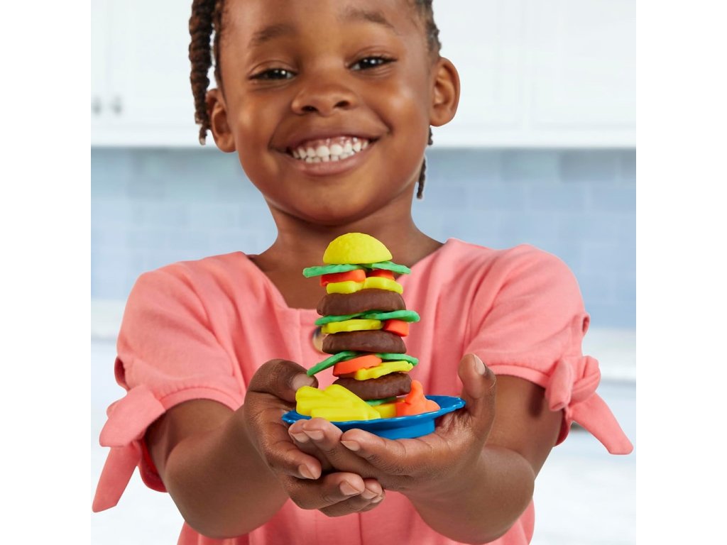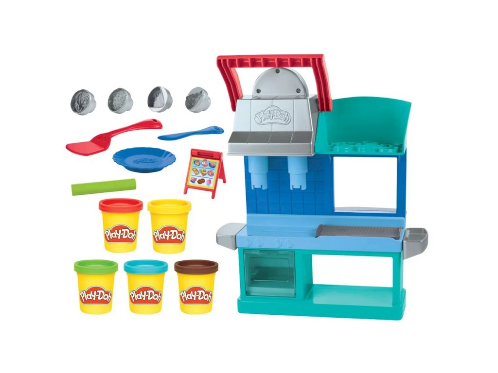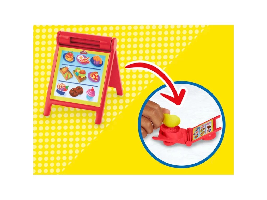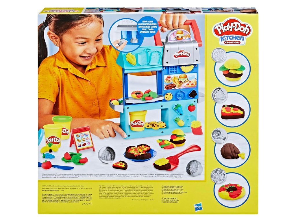S touto dětskou kuchyňskou sadou si mohou malí kuchaři připadat, jako by vedli vlastní restauraci! Vytvářejte, přizpůsobujte a sdílejte úžasné pokrmy vytvořené pomocí cukrářského krému Play-Doh. 4 razítka - stačí stisknout páčku, aby se na těstolinu odrazily dva tvary najednou! Po uvolnění páčky se rošt přesune na vedlejší stanici - je čas na dokončovací práce. Malí kuchaři mohou připravit polevy, aby jejich pokrmy vypadaly jako opravdové. Posledním krokem je servírování - děti mohou své výtvory z těsta položit na talíř a předat je okénkem čekajícímu zákazníkovi!Jedinečné vlastnosti sady: