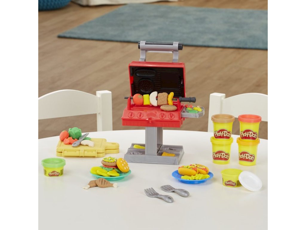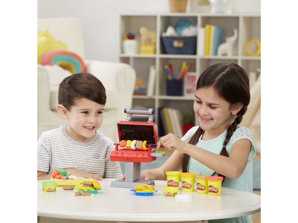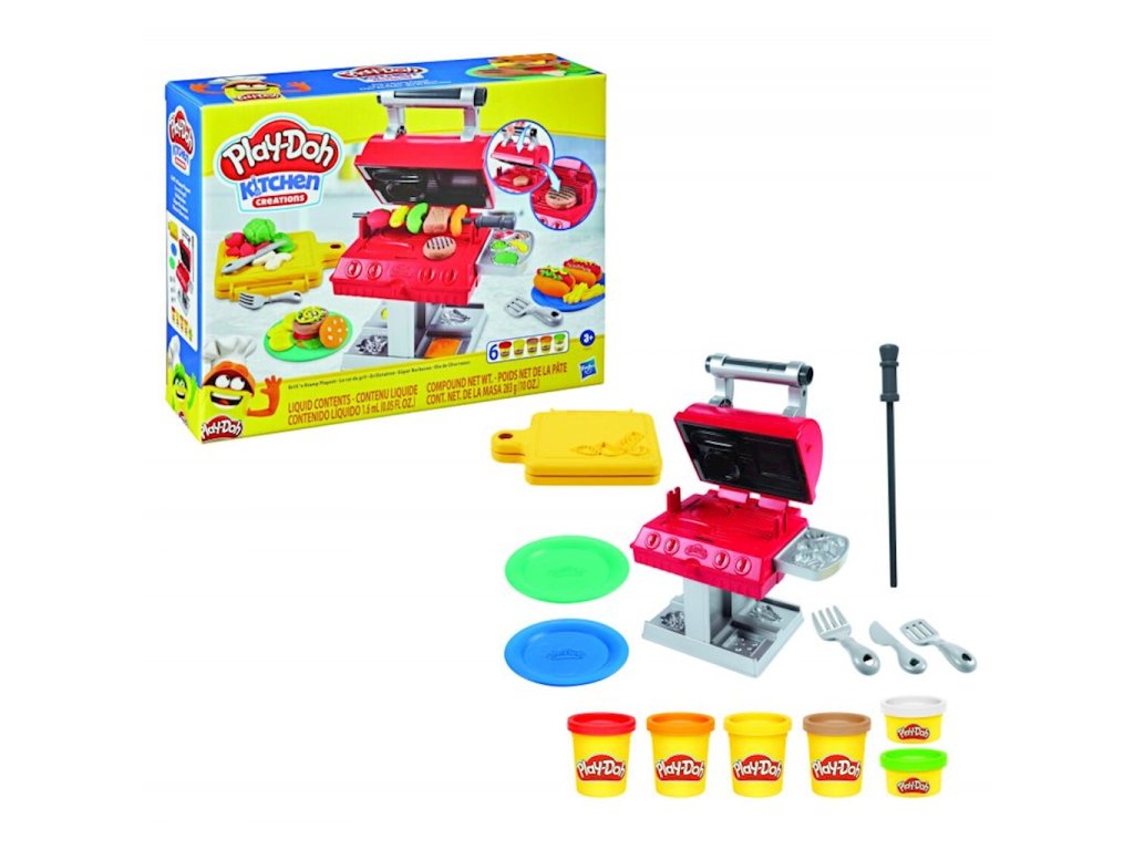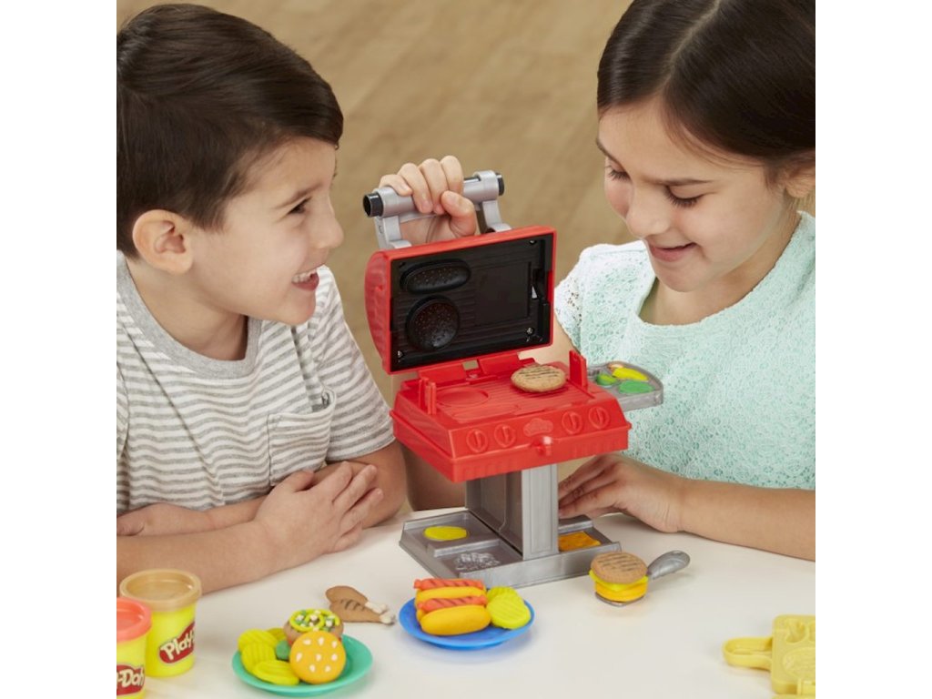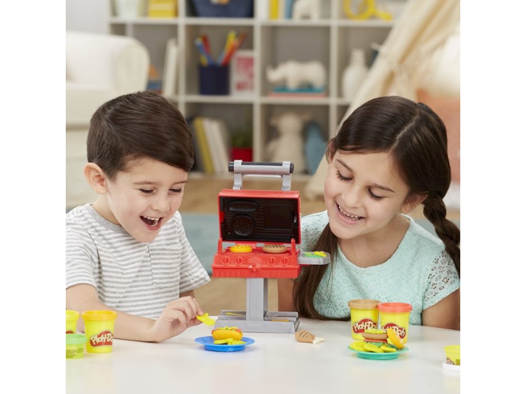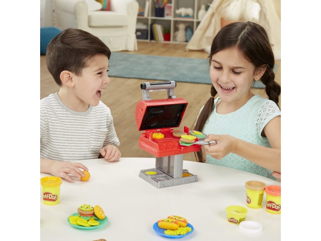 Play-Doh je směs na dorty nebo měkká plastová hmota, s níž si všechny děti mohou vykouzlit, co si vysní! Pro každého se najde něco: v nabídce jsou autíčka a domečky, figurky zvířat a lidí a mnoho dalších doplňků, díky kterým se hraní s Play-Doh nikdy neomrzí! Tolik nápadů se skrývá v malé krabičce! Play-Doh je již více než 40 let kreativní hračkou číslo 1 na světě. Rozvíjí dětskou představivost, kreativitu a manuální zručnost.Staňte se mistrem v grilování se sadou Play-Doh Velké grilování! Vytvořte z těsta hamburgery, klobásky, steaky a další pochoutky, pak je položte na určené místo na grilu a přiklopte! Gril zanechává na jídle z těsta neuvěřitelně realistické stopy! S touto sadou od Play-Doh můžete grilovat bez použití uhlí! Tato grilovací sada Play-Doh přináší zábavu z rodinného grilování přímo do dětského hracího prostoru!