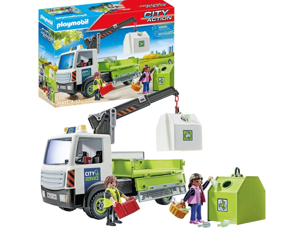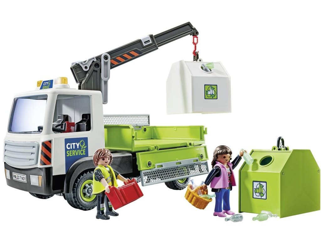 Tato sada je moderní recyklační vůz se sklopnou, zvedací nakládací stěnou a pohyblivým zdvihem vpředu, který umožňuje vyprazdňování kontejnerů. Děti si mohou zahrát každodenní činnosti úklidového týmu – od sběru surovin až po jejich dopravu do zpracovatelského závodu.