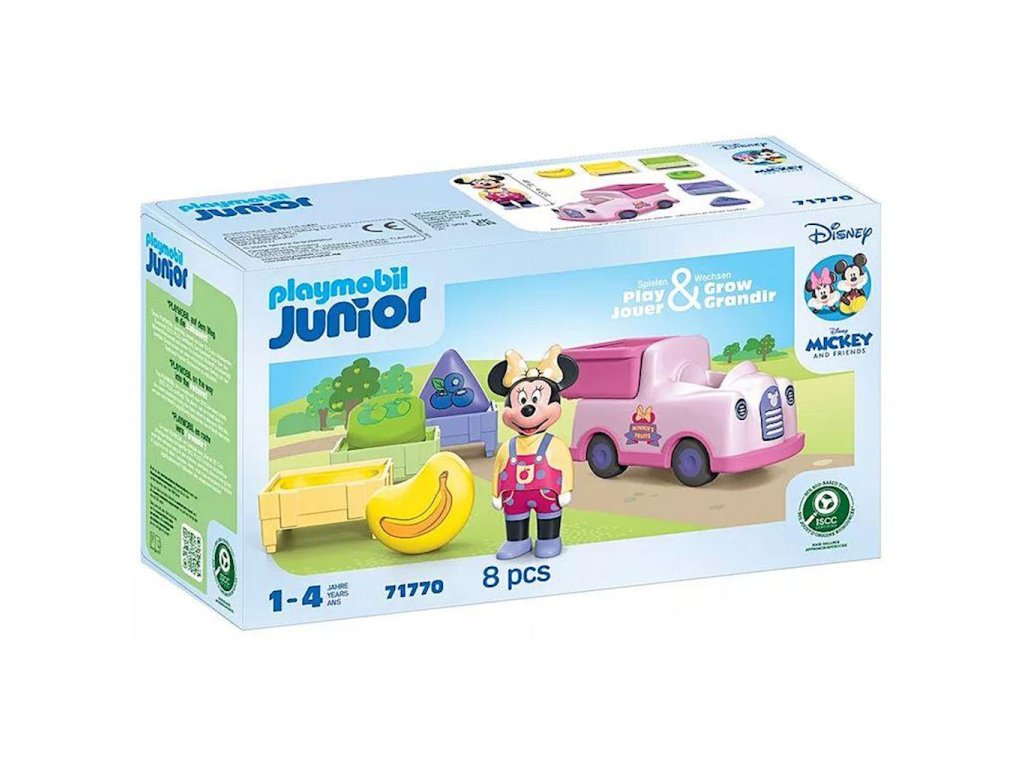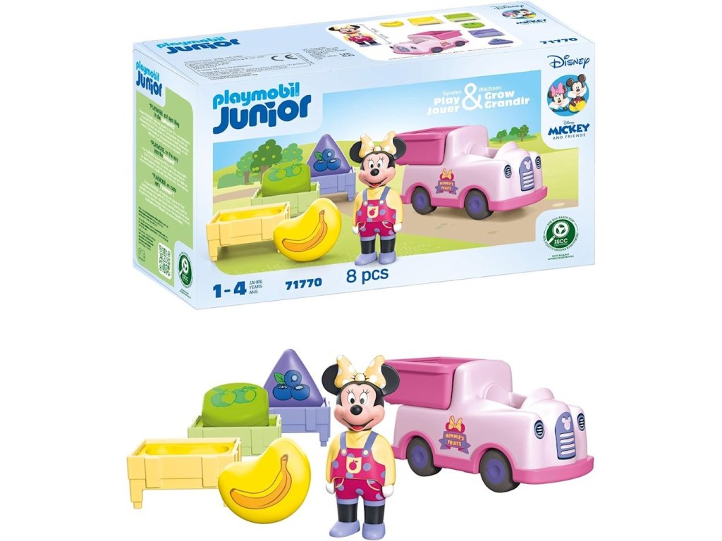 Playmobil Junior & Disney: Mickey Mouse a třídič ovoce 71770Disneyho Minnie Mouse spěchá na cestu. Je trh a je třeba doručit lahodné ovoce. Kdo pomůže roztřídit různé druhy ovoce do správných beden a naložit nákladní vůz, aby se nezpozdil? S touto sadou inspirovanou Disney si vaše dítě hravě rozvíjí smysl pro tvary, učí se barvy a čísla a závodí se svým nákladním vozem na trh. Je čas se dozvědět o různých druzích ovoce a spočítat, kolik jich je. Kdo dokáže roztřídit všechno ovoce do správné bedny? Naplnili jste je všechny? Naskládejte bedny do vysoké věže a naložte je na nákladní vůz. Kdo uhádne, jak otevřít a zavřít zadní dveře? Vydejte se na cestu hned teď. Které ovoce má vaše dítě nejraději?