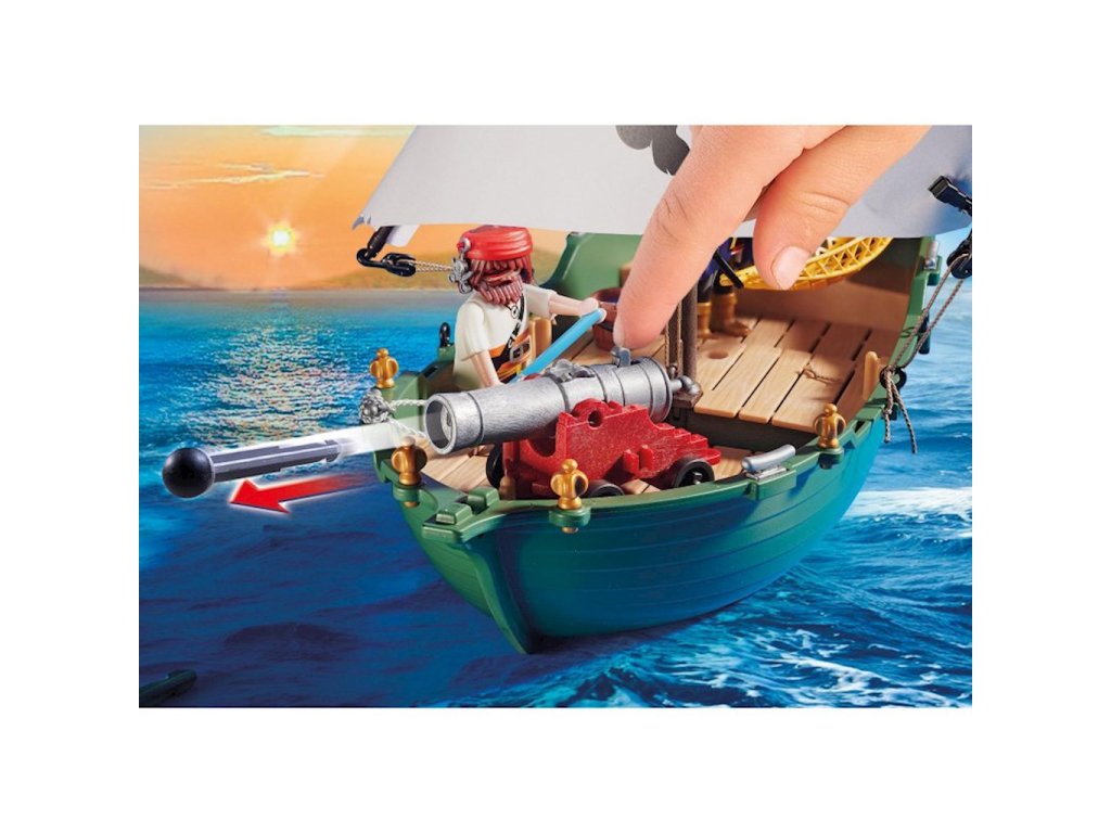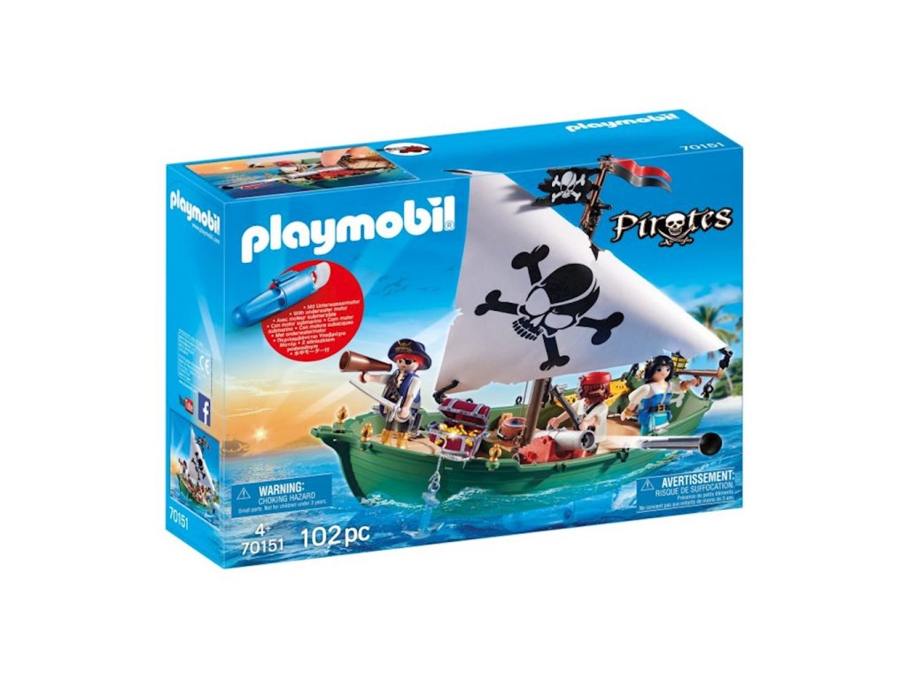 Playmobil Pirátská loď s ponorným motorem 70151Ahoj dobrodružství! Vstupte do fantastického světa pirátů, námořních cest a nebezpečných dobrodružství! Neustále se střetávající posádky pirátů a vojáků, brázdící moře při hledání pokladu, neznají slitování. Mají k dispozici silné bitevní lodě, plachetnice, čluny a vory, které používají k přepravě své kořisti a zajatců do úkrytů a pevností na skrytých ostrovech. Sady Playmobil Pirates, nabité fantastickými detaily, podnítí dětskou představivost a poskytnou hodiny zábavy!
