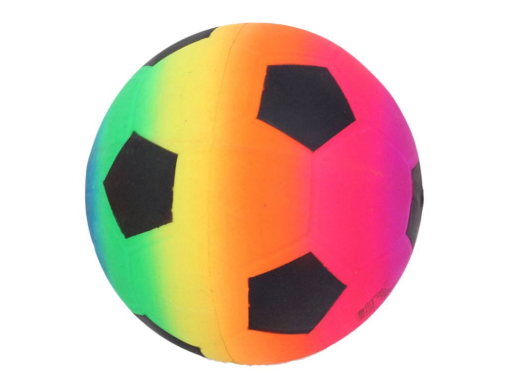 Barevný gumový míč o průměru 22 cm je perfektní volbou pro děti, které milují sport a pohybovou aktivitu. Jeho povrch zdobí intenzivní duhový gradient, který přitahuje pozornost a vybízí ke hře. Klasický motiv černých pětiúhelníků, charakteristický pro fotbal, spojuje výrobek moderní design s tradiční formou.