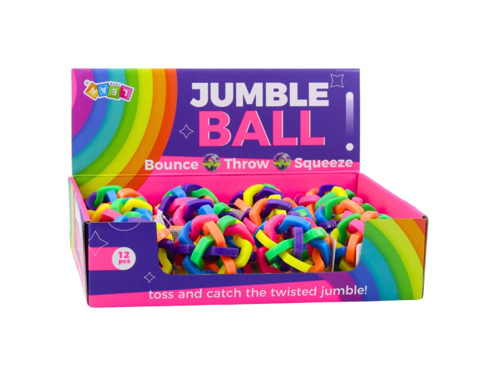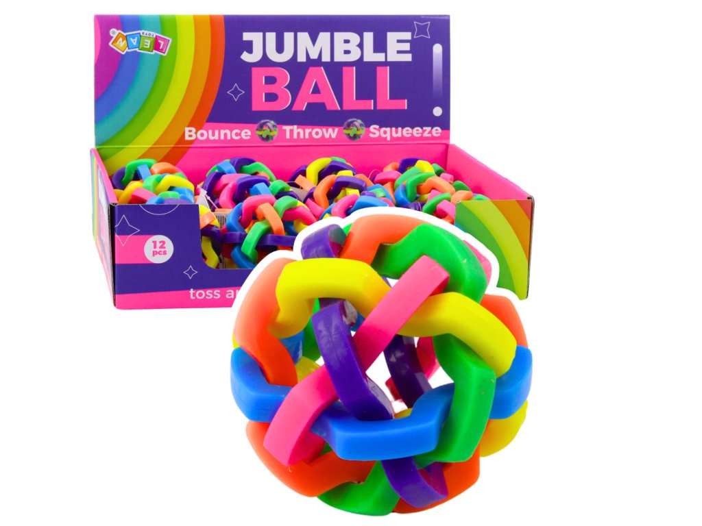 Barevná Jumble Ball je atraktivní smyslová hračka určená pro děti a lidi, kteří hledají antistresovou zábavu. Vyrobeno z pružných, měkkých proužků, které vytvářejí prostorovou mřížku, poskytuje příjemné hmatové vjemy a povzbuzuje k aktivitě. Dá se mačkat, házet, válet a odrážet – podporuje rozvoj motoriky, koordinace a koncentrace.