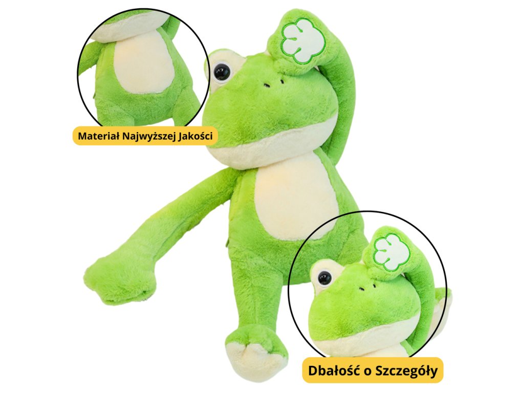Plyšová žába je vtipný a kreativní maskot, který zaujme svým radostným vzhledem a funkčností. Jeho unikátní vlastností jsou magnety ukryté v tlapkách a u očí, které umožňují žabce zakrýt oči, jako by si hrála "koukátko" - ideální pro kreativní hru, která rozvíjí dětskou fantazii a manuální dovednosti. Klasické zelené barevné provedení se světlým bříškem, velkýma výraznýma očima a přátelským úsměvem si žába okamžitě získá sympatie těch nejmenších a stane se jejich oblíbeným společníkem.