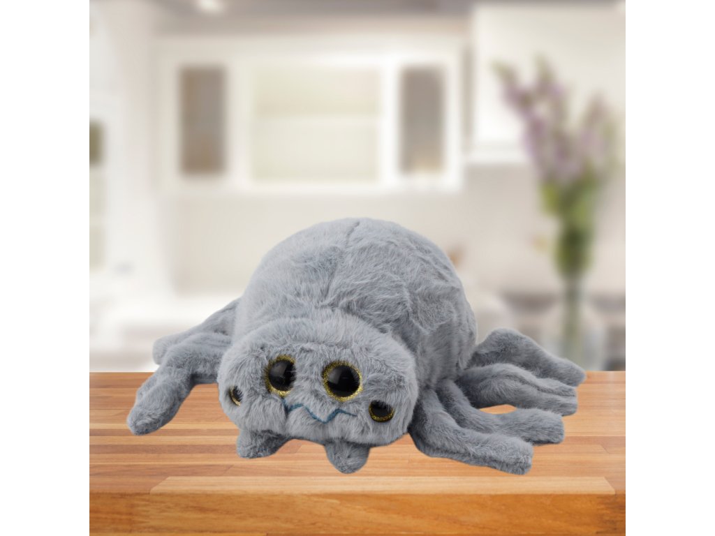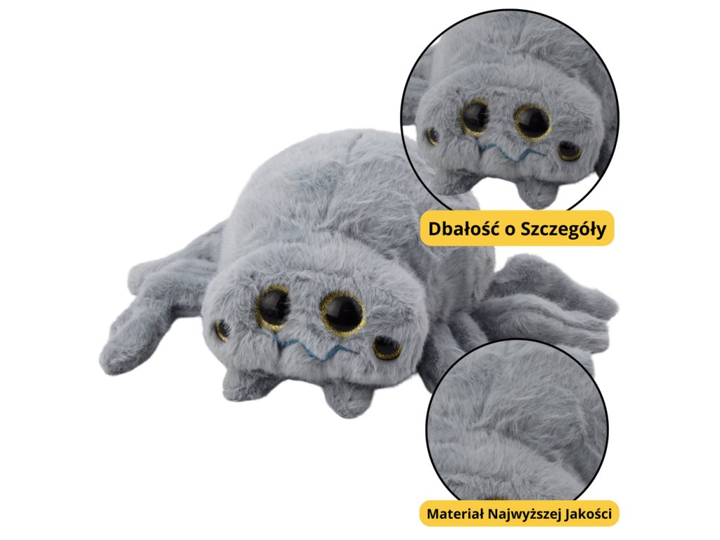 Plyšový pavouk je originální a mimořádně efektní hračka, která jistě zaujme děti, které mají rády neobvyklé maskoty, hmyz a přírodní kuriozity ze světa přírody. Je vyrobena z jemného, na dotek sametového plyše v syté, šedé barvě, která mu dodává lehce tajemný, ale zároveň přátelský a vtipný vzhled. Maskot se vyznačuje pečlivě vyrobenými detaily - má několik párů lesklých očí v různých velikostech, měkké, zaoblené nohy a jemně vyšívaný čenich s úsměvem, díky kterému vypadá výjimečně roztomile a nevzbuzuje strach - ani u mladších dětí.