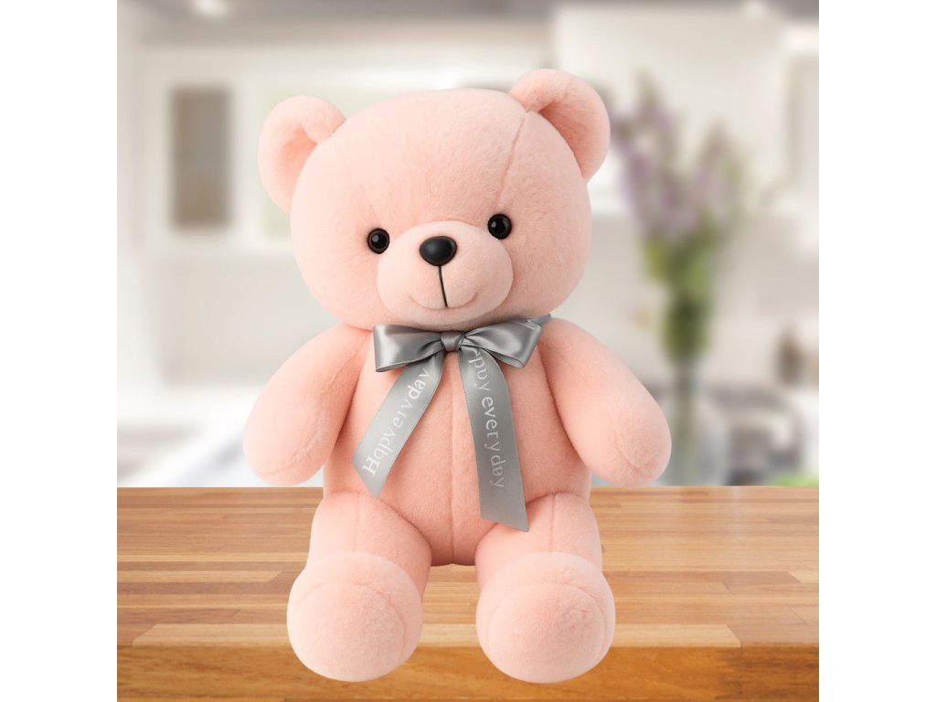 Měkký růžový medvídek je neuvěřitelně okouzlující a útulná hračka, která dokonale kombinuje estetiku a funkčnost. Vyrobeno z výjimečně měkkého a na dotek příjemného materiálu, potěší jednoduchým klasickým designem a jemnými barvami. Jeho hlavní ozdobou je elegantní, saténová mašle ve stříbrné barvě s nápisem "Happy every day", která dodává eleganci a dělá z něj skvělý dárek.