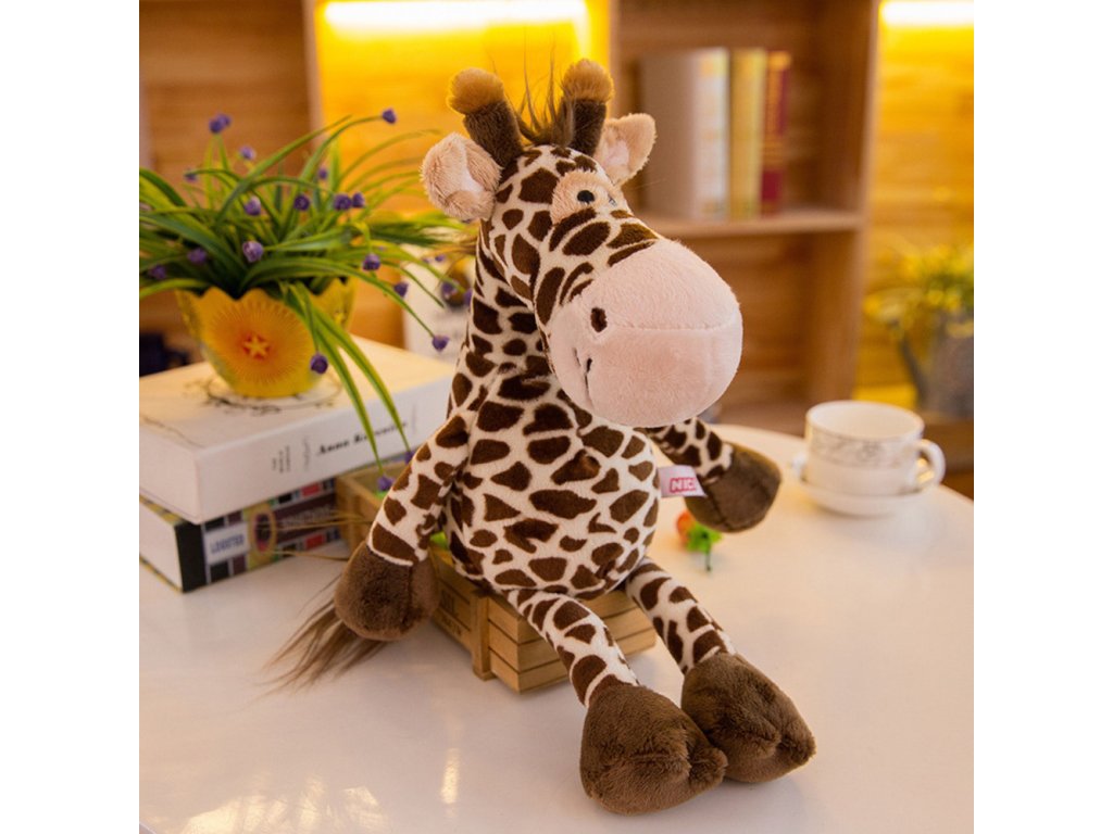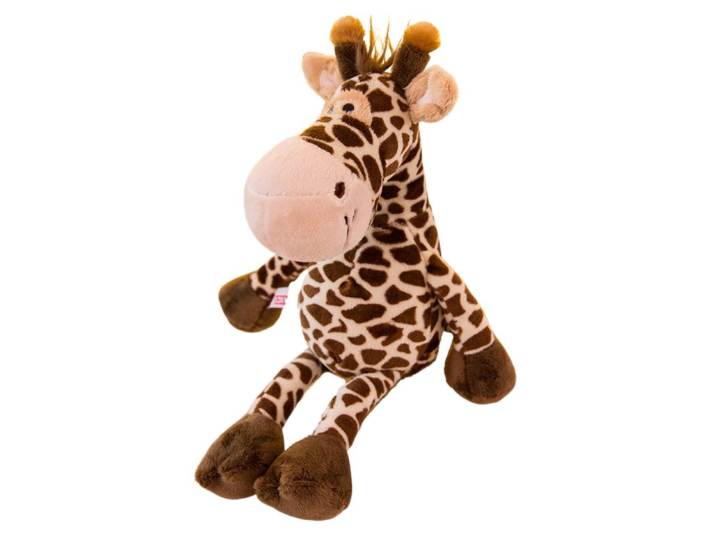 Plyšová žirafa je hračka, která potěší svým originálním vzhledem, měkkým tělem a dlouhým krkem - stejně jako v přírodě. Vzor charakteristických hnědých skvrn na krémovém podkladu dává hned jasně najevo, s jakým zvířetem máme co do činění. Díky přátelskému čenichu a protáhlé siluetě vzbuzuje žirafa sympatie a skvěle poslouží jako plyšová hračka a dekorace dětského pokojíčku.