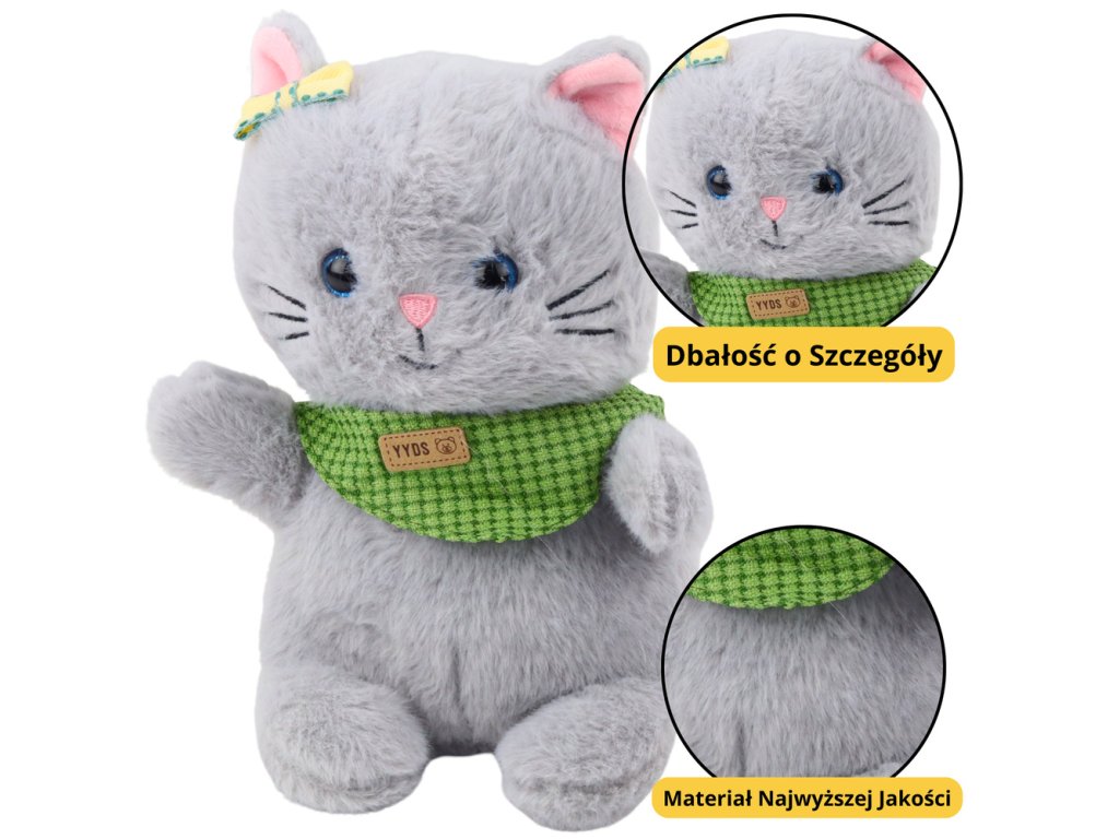 Plyšové kotě je neuvěřitelně půvabná hračka, která potěší svou jemností, subtilním vzhledem a přátelským charakterem. Je vyrobena z jemného, šedého plyše, který je příjemný na dotek a zcela bezpečný pro nejmenší. Hračka se vyznačuje elegantním detailem v podobě zeleného šátku pod krkem a žluté mašle na uchu, které jí dodávají na jedinečném kouzlu.