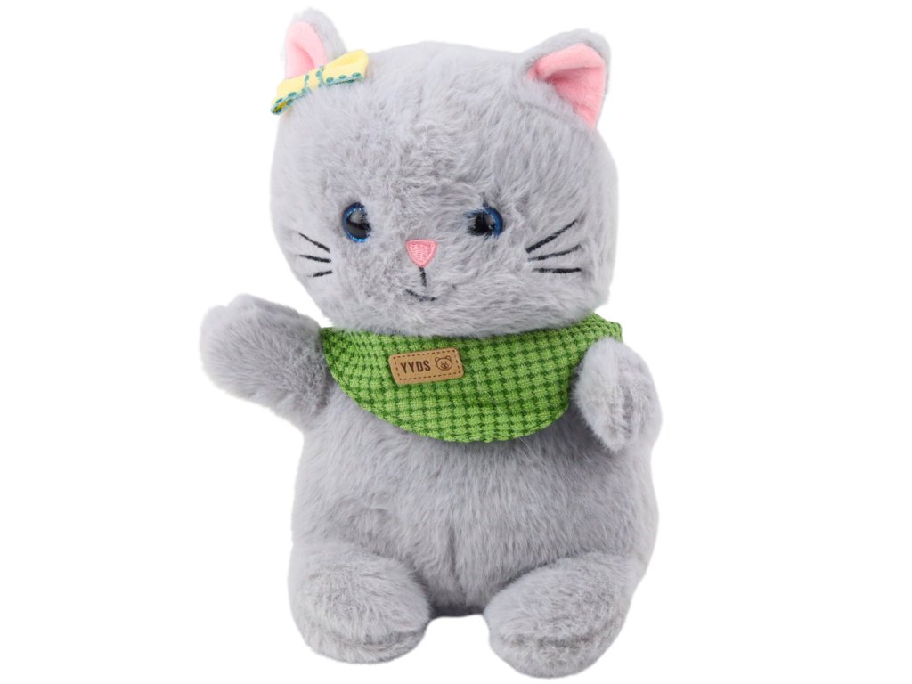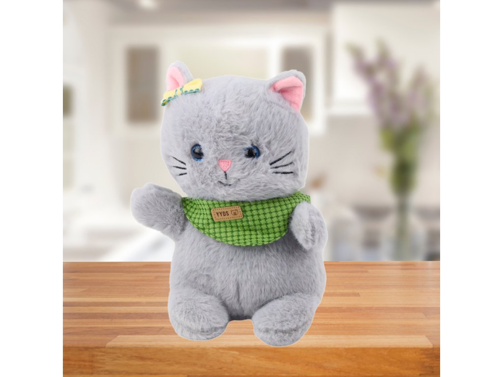 Plyšový maskot mazlivá kočka šedá se zelenou šálou a mašlí 22 cm