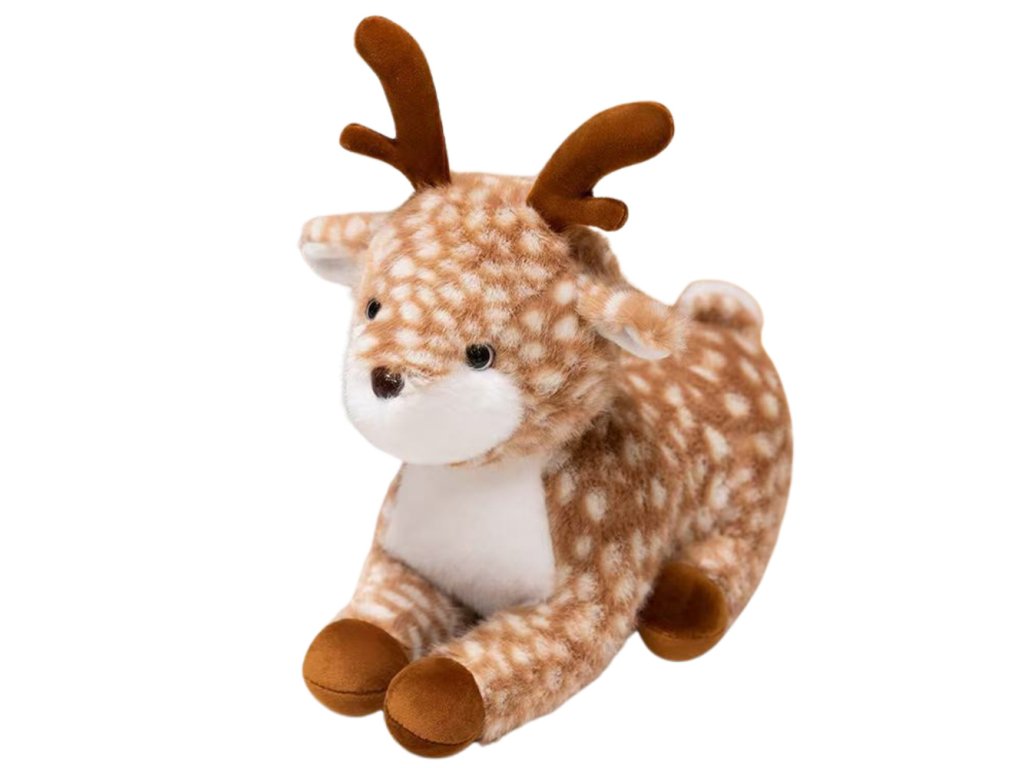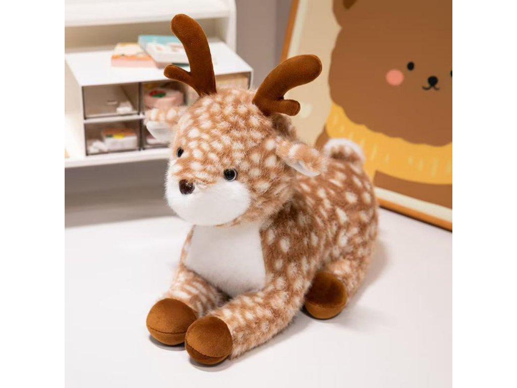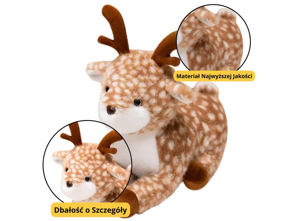 Plyšový jelen je okouzlující a přirozeně vypadající maskot, který potěší svým jemným výrazem a jedinečným vzorem srsti připomínající skutečný kabátek mladého jelena. Vyrobeno z kvalitního hebkého plyše, je mimořádně příjemné na dotek a bezpečné pro děti již od útlého věku. Jeho teplé, hnědo-bílé barvy, měkké paroží a jemně zaoblené tvary z něj dělají dokonalého společníka pro mazlení, každodenní hry a klidné usínání.