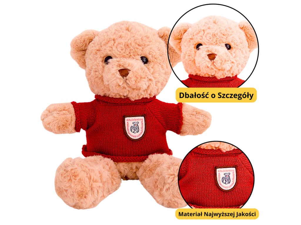 Medvídek v červeném svetru je klasickým a zároveň výjimečně okouzlujícím maskotem, který dokonale spojuje nadčasové kouzlo tradičních plyšových hraček s estetickým a stylovým akcentem - pleteným oblečením v intenzivní červené barvě. Hračka je vyrobena z kvalitního, hebkého a heboučkého plyše v teplém odstínu hnědé, který je příjemný na dotek a bezpečný i pro nejmenší děti. Hustá srst, zaoblené tlapky a pěkný obličej s vyšívaným nosem a očima tvoří harmonický, přátelský celek, který potěší svou přirozeností.