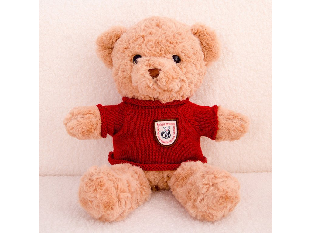 • Plyšový medvídek v červeném svetru