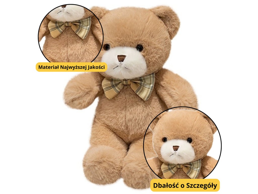 Medvídek je oblečený v elegantním károvaném motýlku, který mu dodává jedinečné kouzlo a skvěle vypadá jako dekorace do dětského pokoje nebo stylový dárek. Díky své stabilní konstrukci a proporcionální siluetě může samostatně sedět, což z něj dělá atraktivní prvek dekoru.