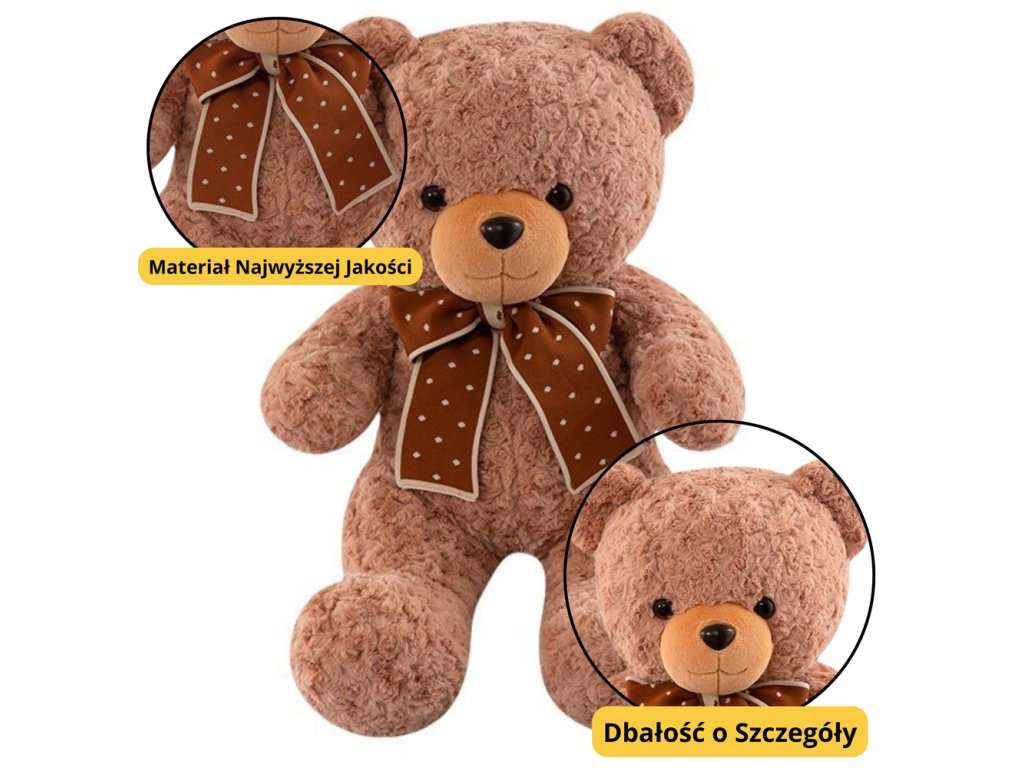 Velký plyšový medvěd s mašlí je klasický a nesmírně okouzlující maskot, který zaujme nejen svou velikostí, ale také jemností a elegantní úpravou. Medvídek, vyrobený z příjemného na dotek, nadýchaného materiálu s mírně kudrnatou strukturou, je ideální pro společné mazlení a relaxaci. Jeho hřejivá, hnědá barva a dekorativní, materiálová mašlička v puntících mu dodávají jedinečný charakter a nadčasové kouzlo.