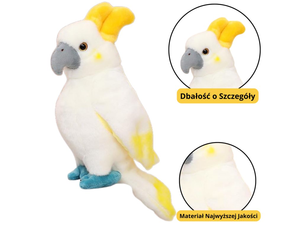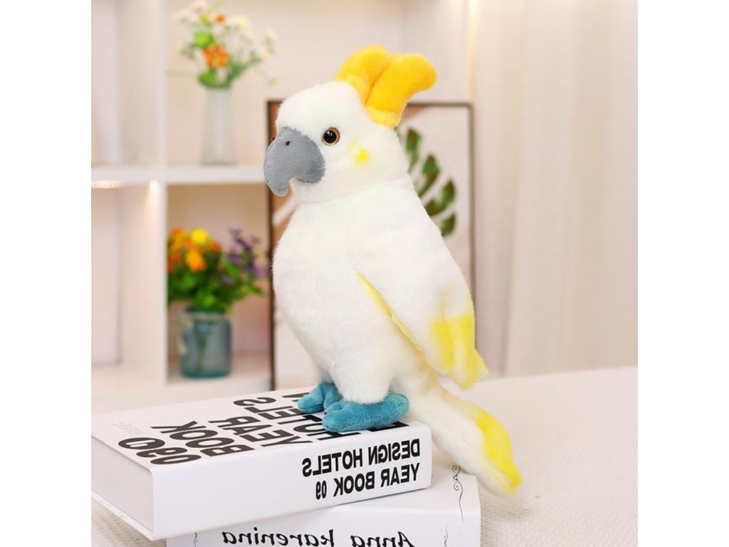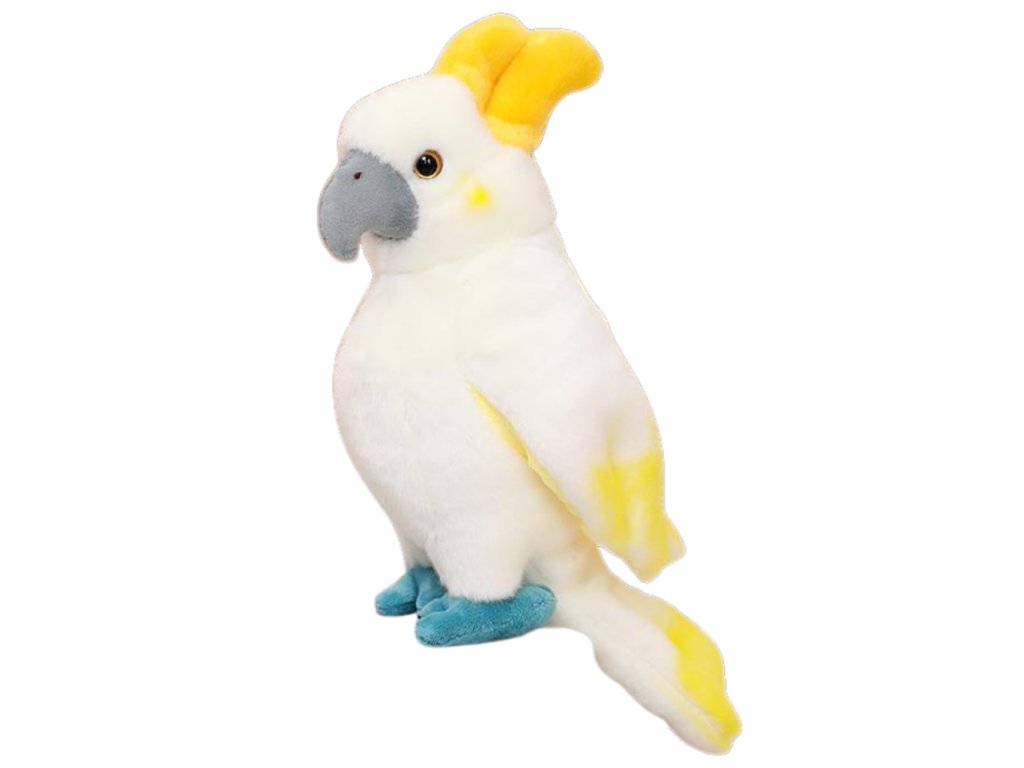 Plyšový papoušek kakadu je nádherně vyrobená hračka v podobě exotického ptáčka, která v sobě snoubí estetické, vzdělávací a smyslové hodnoty. Díky svému jedinečnému vzhledu – bílé opeření, charakteristický žlutý hřeben, šedý zobák a modré tlapky – se skvěle hodí jako plyšová hračka, ale také jako dekorace do dětského pokoje, školky nebo terapeutické místnosti.