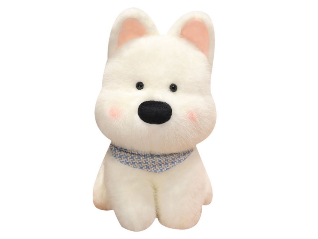 Plyšový bílý pejsek je nesmírně okouzlující maskot, který na první pohled vzbuzuje sympatie. Je navržen s důrazem na detail a vyznačuje se jemnou, sněhově bílou srstí, velkým černým nosem a jemnými ruměnkami na tvářích. Jeho sladké, černé oči a odstávající uši mu dodávají jedinečné kouzlo a dodatečným akcentem je ozdobný šátek v odstínech modré, který zdůrazňuje jeho přátelský charakter.