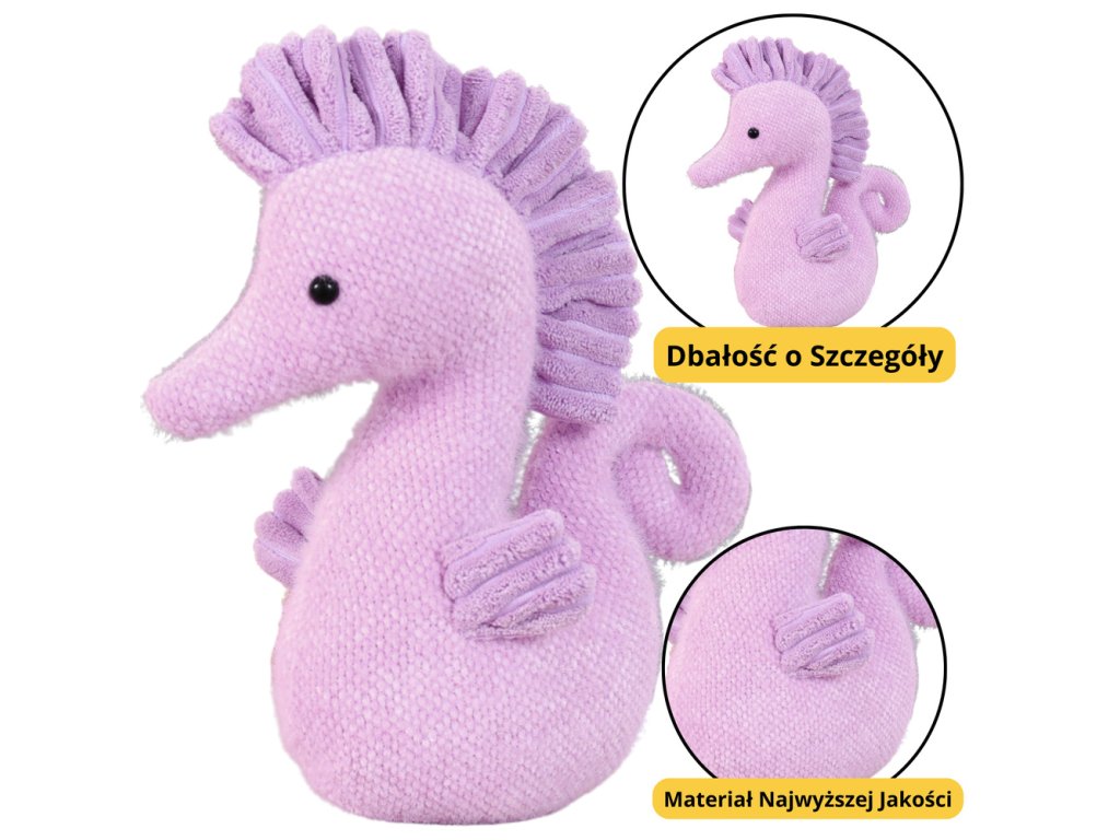 Okouzlující fialový mořský koník je dokonalým společníkem na hraní a spánek pro každé dítě bez ohledu na věk. Je vyrobena z mimořádně měkkého, na dotek příjemného materiálu, který se zahalí do jemnosti a vybízí k častému objímání. Jeho vzhled byl zušlechtěn s velkou péčí - má bezpečné oči, pečlivě tvarovaný čenich a efektní, texturovaný hřeben připomínající skutečného mořského koníka. Všechny tyto detaily způsobují, že hračka vypadá nejen realisticky, ale také velmi esteticky.