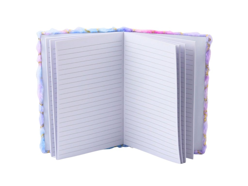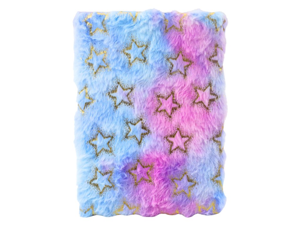Tento plyšový linkovaný zápisník s ozdobným motivem zlaté hvězdy je dokonalým spojením estetiky a funkčnosti. Jeho měkký, na dotek příjemný obal v pastelových barvách upoutá pozornost a zpříjemní každodenní používání. Obal kombinující růžovou, modrou a fialovou barvu zdobí třpytivé třpytivé hvězdičky, které dodávají jedinečný, magický nádech.