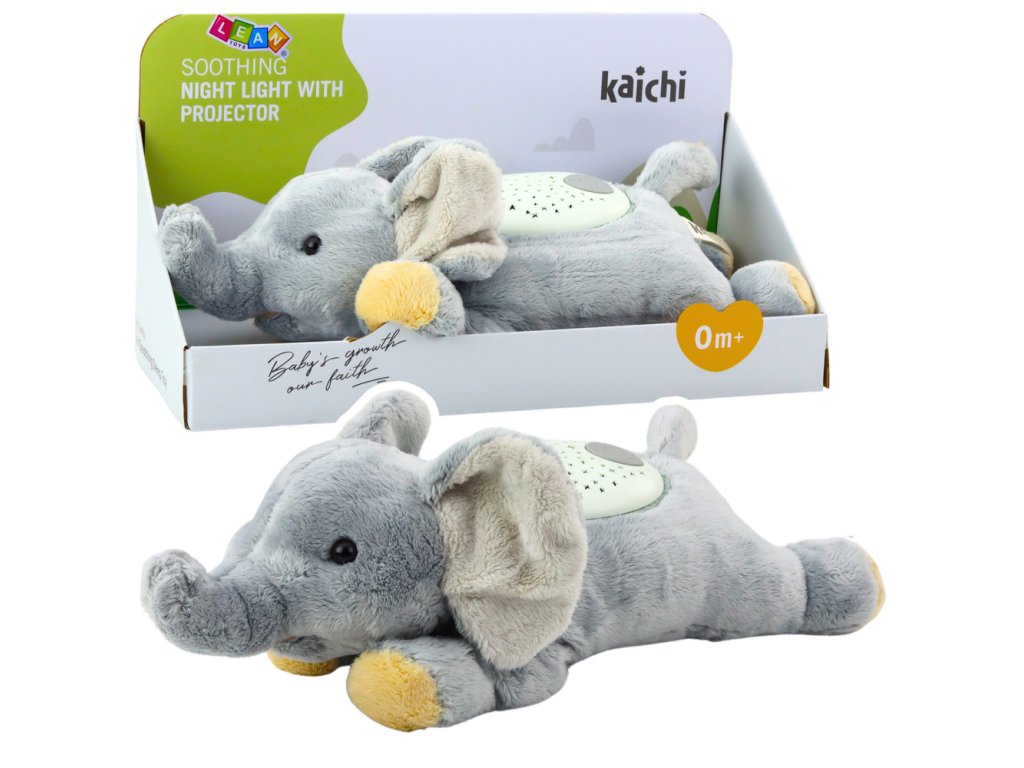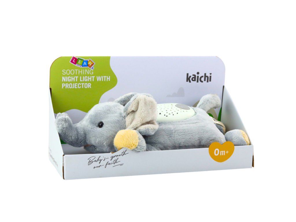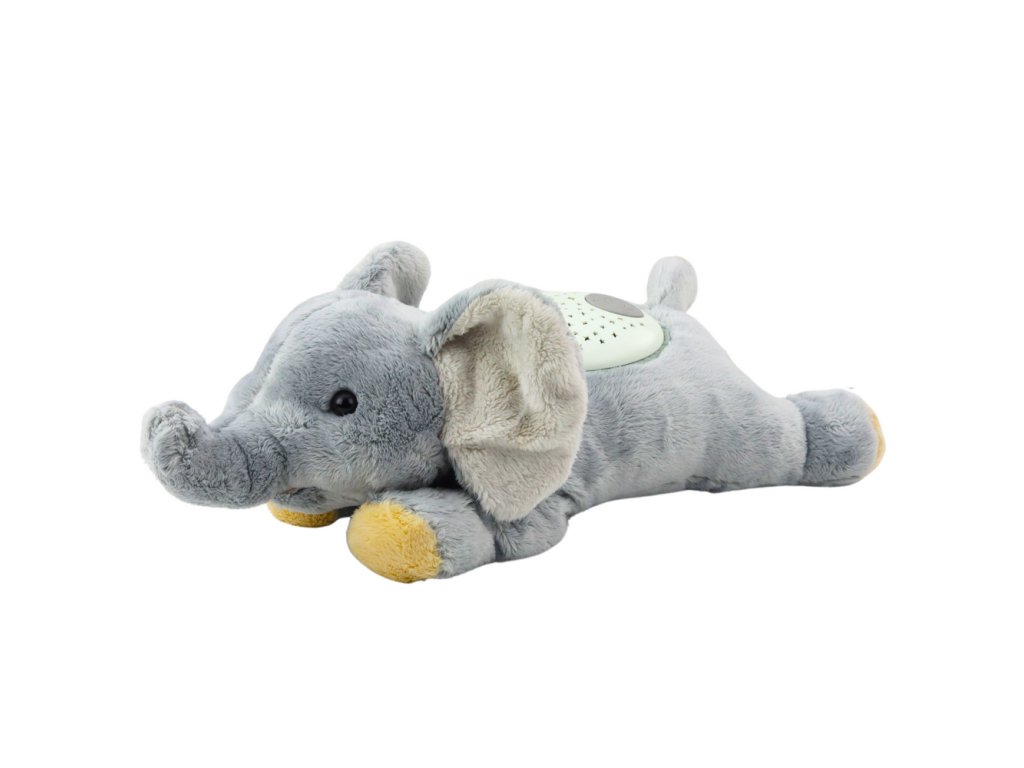 Vestavěný projektor umístěný na hřbetě slona vytváří relaxační projekci hvězd a jemných, barevných světel, které decentně osvětlují místnost a přitahují dětské oko. Mezi zvukové prvky patří nejen klidné melodie, ale také hluk a zvuk tlukotu srdce - zvuky podobné těm, které slyší miminko v bříšku maminky, což podporuje klid a buduje pocit blízkosti.