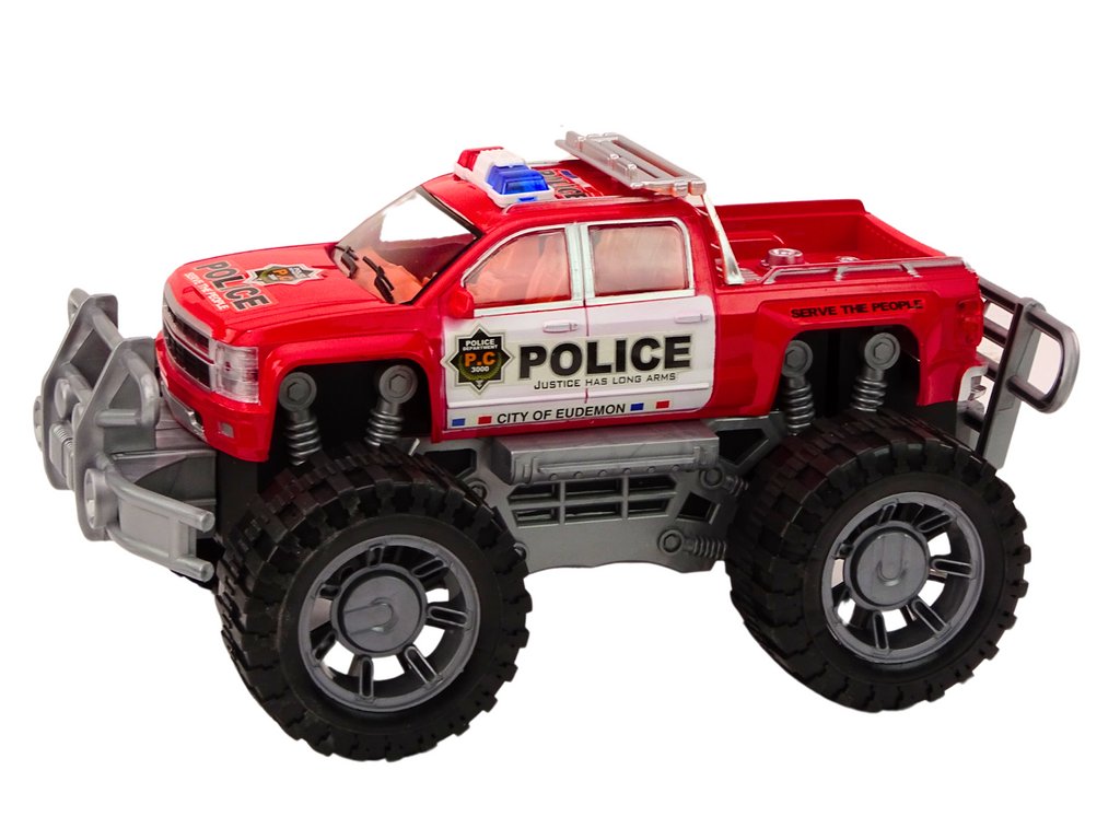 Vozidlo je vybaveno velkými černými terénními koly, která zajišťují vynikající trakci na různých površích a umožňují hru v náročnějších podmínkách. Karoserie vozu je natřena červenou barvou a zdobí ji nápis "POLICE", což mu dodává na autentičnosti. Na střeše jsou policejní kohouty, které podtrhují jeho funkci a vzhled.