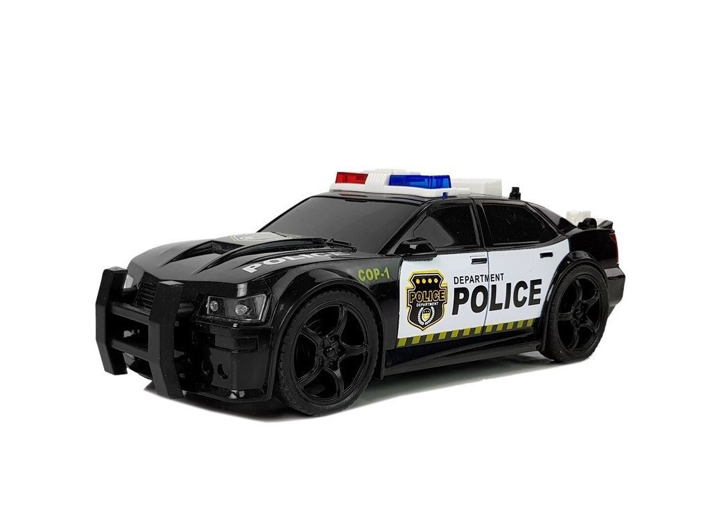 Udělejte svému dítěti skvělý dárek! Auta jsou nejoblíbenější hračky, které milují chlapci všech věkových kategorií. Používají se pro různé hry, které jsou omezeny pouze dětskou fantazií. Jedinečné policejní auto na hraní. S touto hračkou si vaše dítě bude moci celé hodiny hrát na policejní honičky. Množství her jistě znemožní vašemu dítěti odtrhnout se od svého nového vozidla. Závodní auto s třecím pohonem je vyrobeno z plastu s pryžovými pneumatikami. Hračka ve vašem dítěti vzbudí velkou zvědavost, která pomůže rozvíjet dětskou fantazii a ovlivňovat správný vývoj. Auto má světelné a zvukové efekty po stisknutí tří tlačítek na střeše vozidla. Zvuk policejních signálů za jízdy zpříjemní chvíle vašeho dítěte. Další výhodou je otevírací zavazadlový prostor vozu. Auto je vyrobeno v krásné černé barvě s prvky bílé.