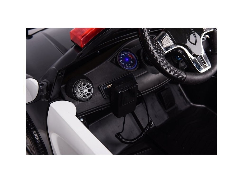 Uvnitř světlé varianty policejního auta pro děti je pohodlná pohovka vyrobená z ekokůže a ergonomický volant, jehož rozměry byly přizpůsobeny rozměrům rukou několikaletých dětí. Určitě další velkou předností bude modře podsvícená palubní deska, která má imitace připomínající důležité ukazatele a hodiny, jako je rychloměr nebo otáčkoměr. V druhé části kokpitu je audio panel umožňující příjemné cestování s vašimi oblíbenými zvuky na pozadí. Design hudebního přehrávače obsahuje zdířky MP3, USB a TF, díky kterým si každý uživatel bude moci připojit svůj přehrávač.