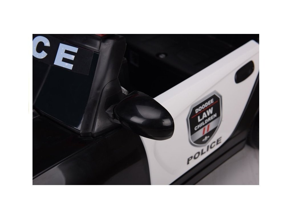 Představené černé bateriové vozidlo přitahuje pozornost již z dálky. Černé tělo je pokryto četnými samolepkami v kontrastních barvách, jejichž vzor je zachován v policejní konvenci. Chybět nebudou jak nápisy POLICIE , tak obrázky připomínající skutečný policejní odznak. To není vše – nad rámečkem zatmaveného čelního skla jsou modro-červená světýlka, která jistě vykouzlí široký úsměv na tváři každého dítěte.
