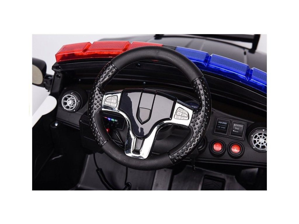 Jste zvědaví, čím prezentovaný policejní vůz nejen skvěle vypadá, ale zaručuje zábavu na stejně vysoké úrovni? Pohání ho duální motor 2x35W , který v kombinaci s baterií 12,5 V Ah umožňuje jízdu rychlostí 3 až 5 km/h. Není to všechno. Za zmínku stojí, že bateriová verze policejního vozu pro děti je vybavena automatickou převodovkou s 3stupňovou regulací.