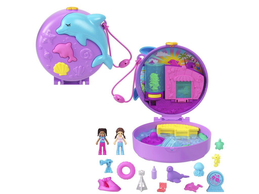Kompaktní sada akvária Polly Pocket Dolphin HWN96Tato rozkošná hračka Polly Pocket má exteriér s motivem delfínů a zábavnou funkci fidget popper! Otevřete kompaktní balíček a objevte rušné centrum pro záchranu zvířat se dvěma mikropanenkami a 12 doplňky, včetně podvodních zvířat. Panenka Shani miluje pozorování ryb v akváriu! Projeď se s jejím přítelem chobotnicí nebo surfuj na vlnách! Pomocí otočného dalekohledu spatříte mořské tvory – skládací dvířka se otevírají do záchranného tanku. Když je čas vyrazit, zabalte sadu a vezměte si ji s sebou pro zábavu na cesty! Ideální pro děti od čtyř let, zejména pro ty, kteří milují péči o zvířata.