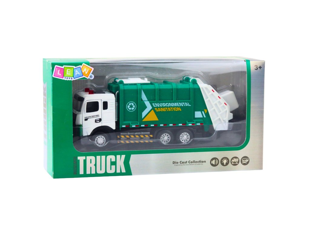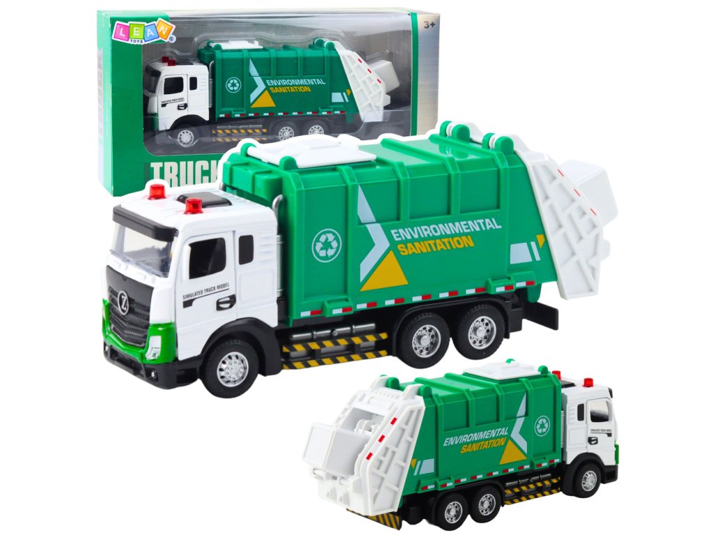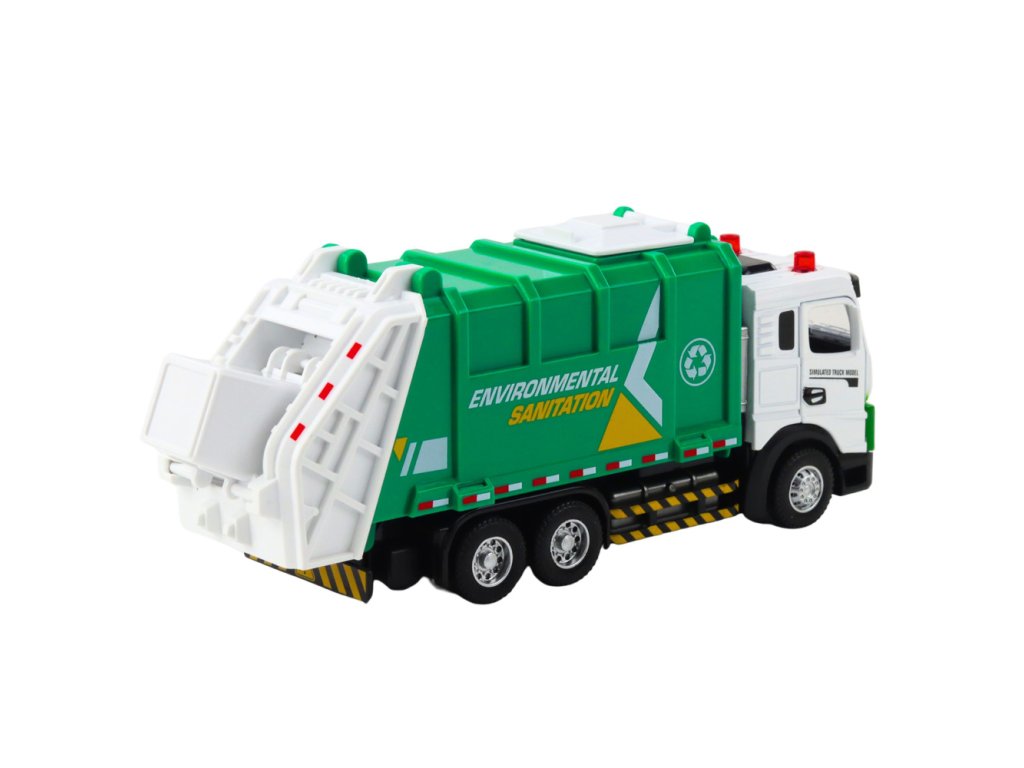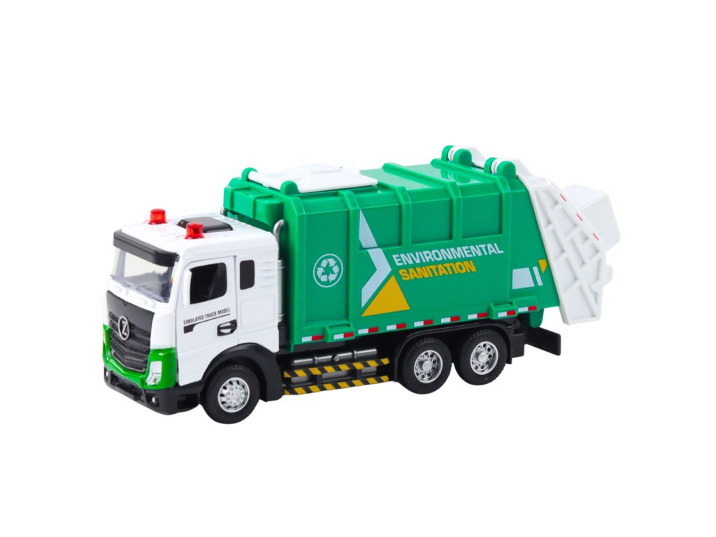 Popelářské auto pro děti – kovová kabina, kontejner, světla a zvuky, zelené
