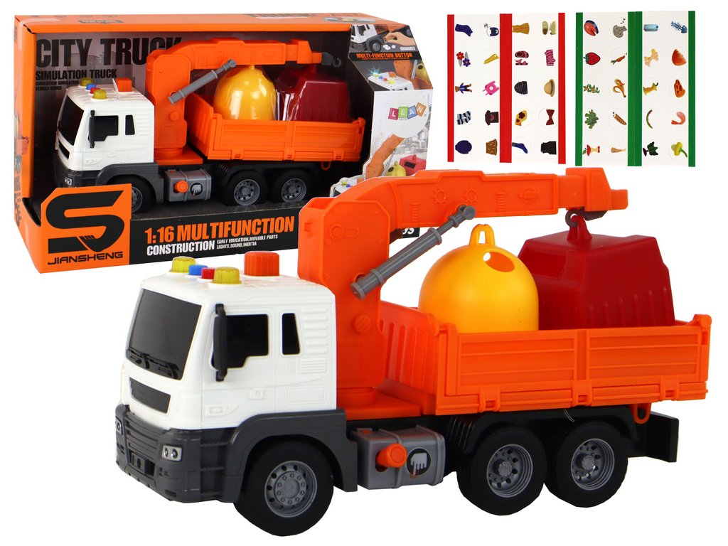 Další atrakcí je jeřáb umístěný na střeše kamionu. Když stisknete oranžové tlačítko, rám jeřábu se zvedne a do hry přidá prvek interakce a kreativity. Dítě může zvedat a spouštět kontejnery, hrát scénky se sběrem a tříděním odpadků.